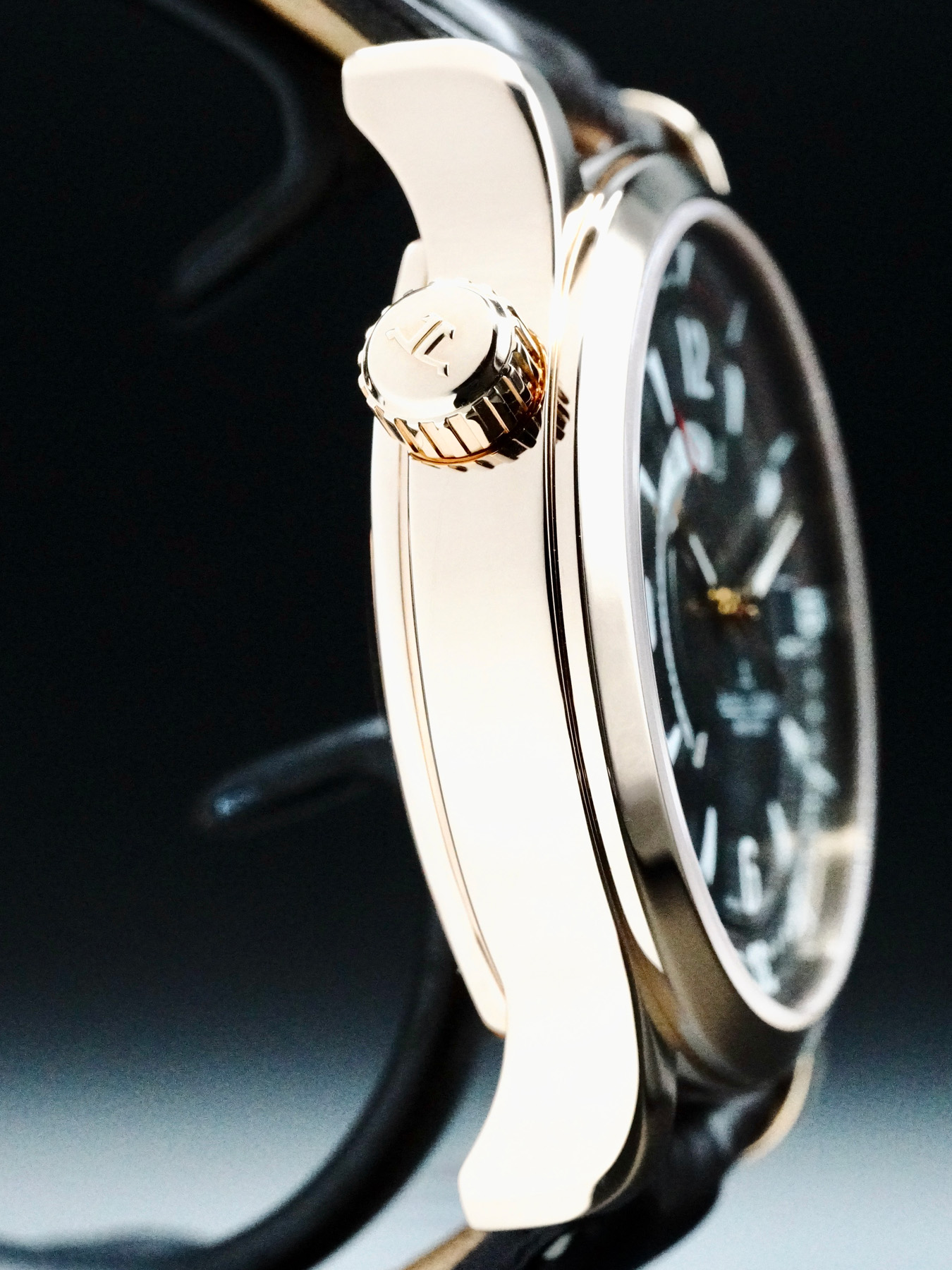 This watch features a 44 mm rose gold case on leather strap. This watch also sports a black dial. Powered by a mechanical automatic movement. Water resistance up to 100 meters.
