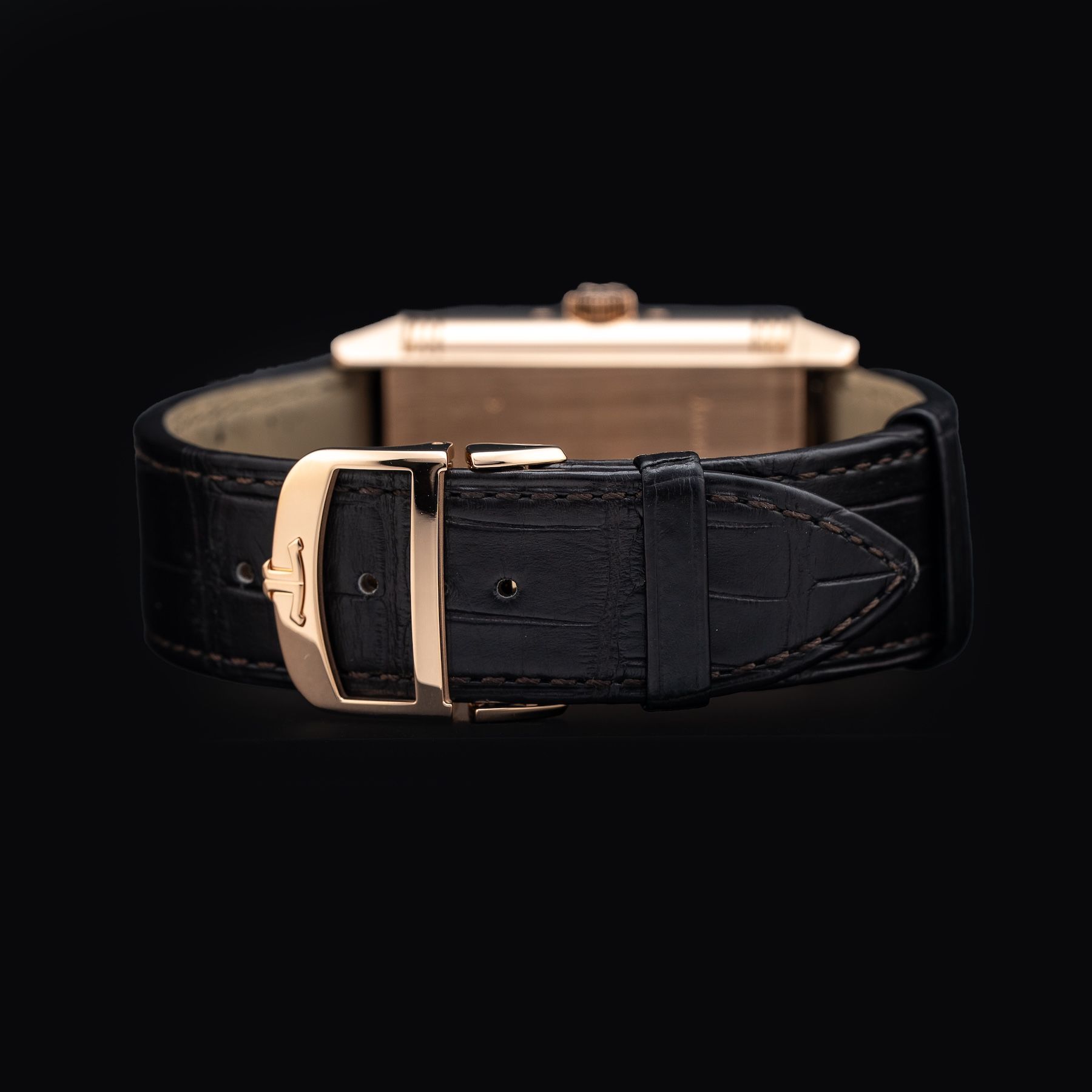 This watch features a 29.9mm 18k rose gold five-body case on leather strap. This watch also sports a silver grained/frosted and Grey Velvety Clous de Paris guilloché dial. Powered by a manual-winding movement. Water resistance up to 30 meters.