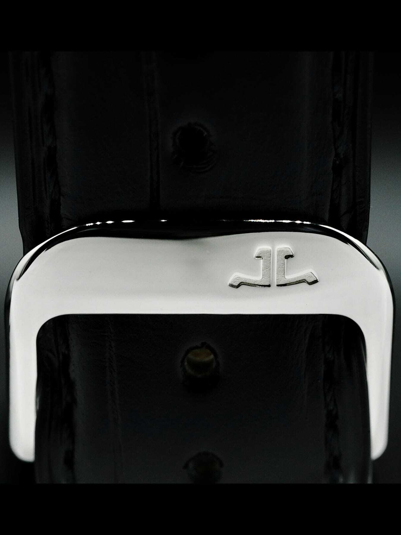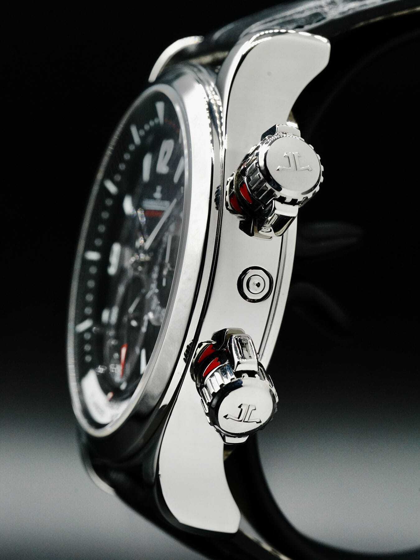 This Jaeger LeCoultre Geographic 146.8.83 features a 42mm steel case on leather strap. This watch also sports a black dial.