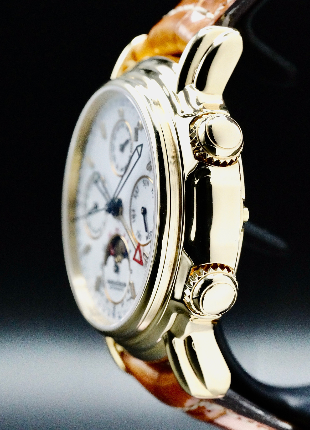 This Jaeger LeCoultre Grand Reveil features a 41mm 18k yellow gold case & bezel with a solid case back on a brown leather strap with an 18k yellow gold pin buckle. This watch also sports a white dial with skeleton hands, index dial markers, and moon phases covered by scratch resistant sapphire crystal.