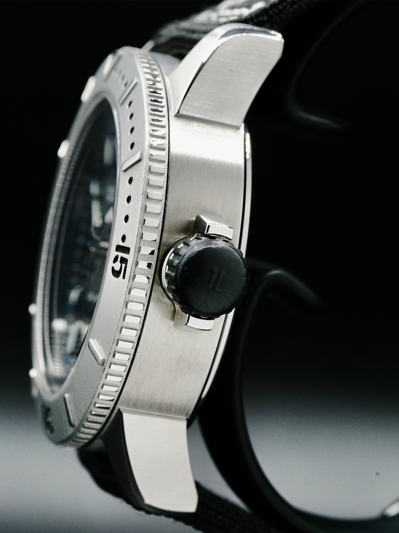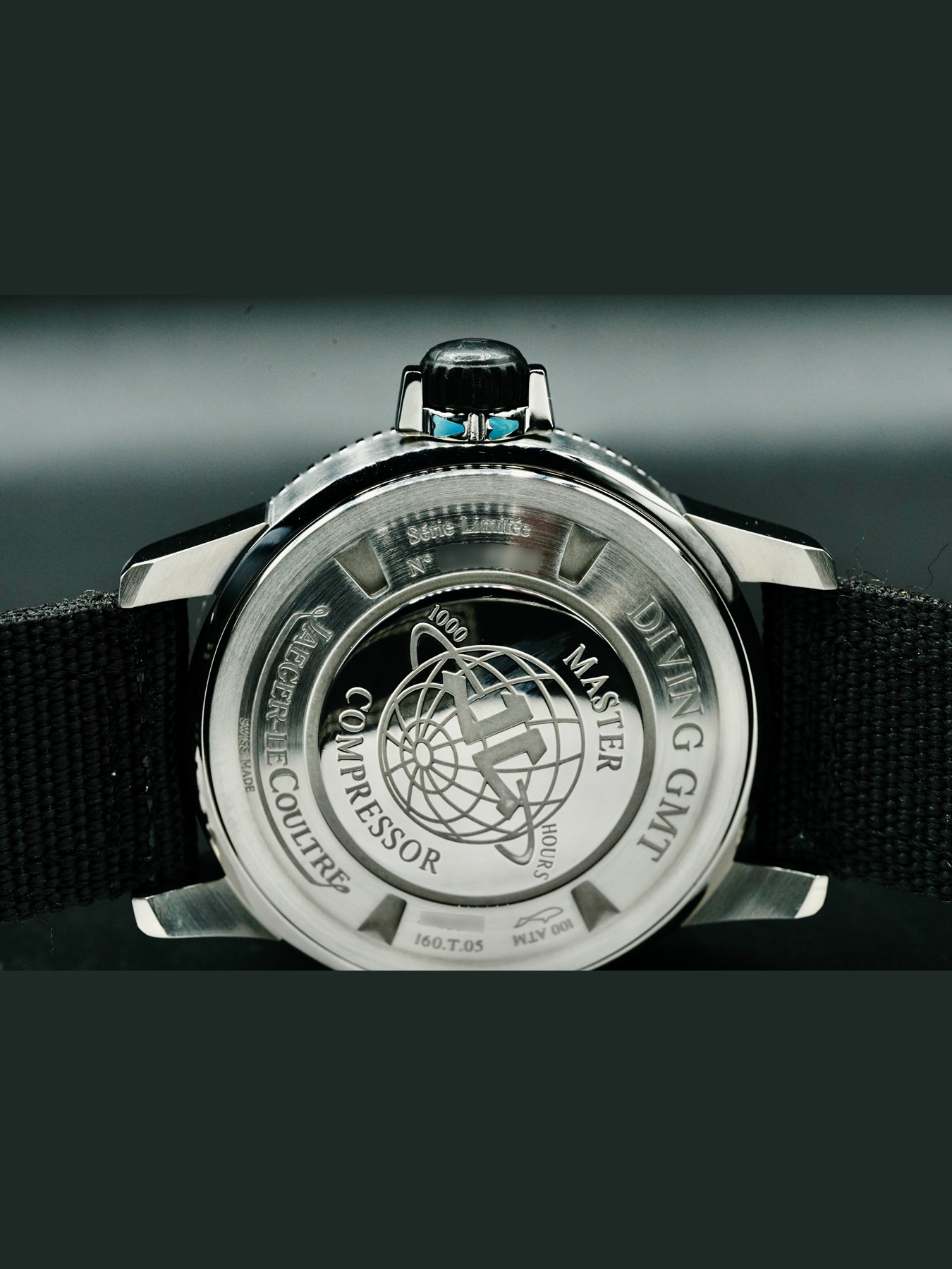 This Jaeger LeCoultre Master Compressor GMT 160.T.05 features a 44mm titanium case on nylon strap. This watch also sports a black dial.