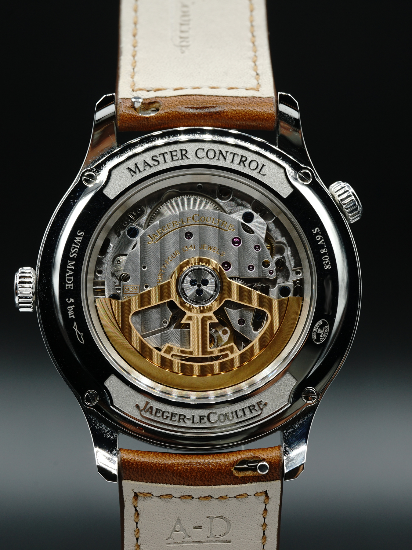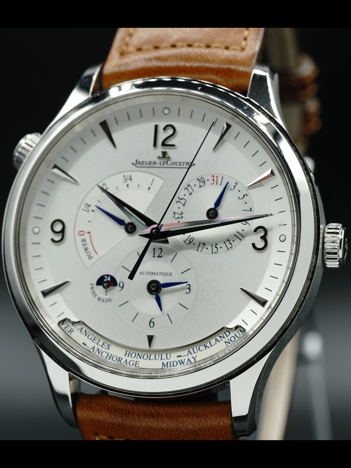On the sunrayed silver dial of the Master Control Geographic in stainless steel, the elongated hands displaying the local time stand out in the center. Selected by means of the crown, the second time zone is revealed in an aperture at 6 o'clock. Just below, on a rotating interior rehaut, the 24 time zones and the name of their emblematic city in blue pass by. On the left, between the numbers 9 and 12 o'clock, lies the power reserve. On the right, between the numbers 12 and 3 o'clock, lies the date counter. Two functions much sought after by tireless globetrotters.