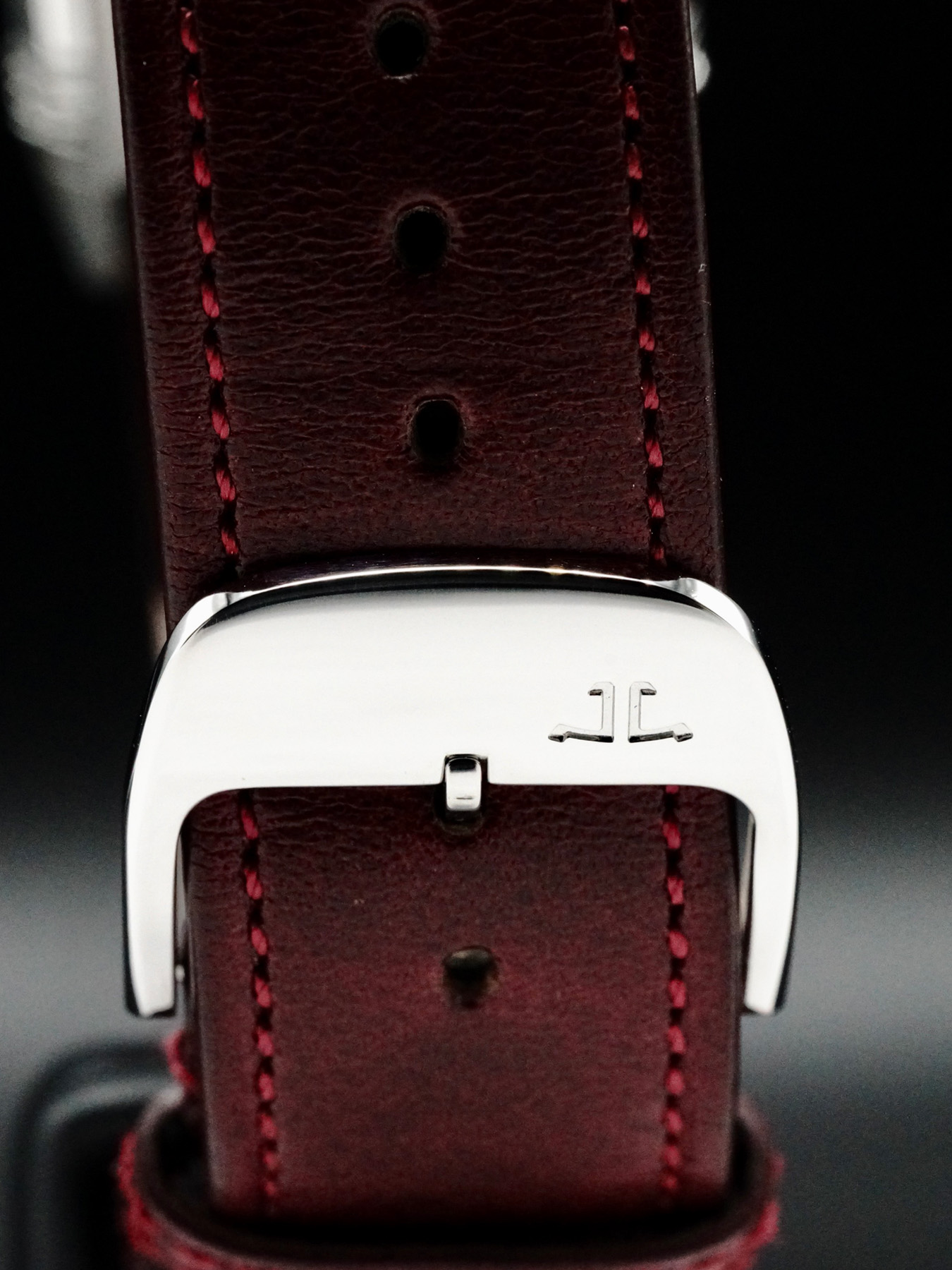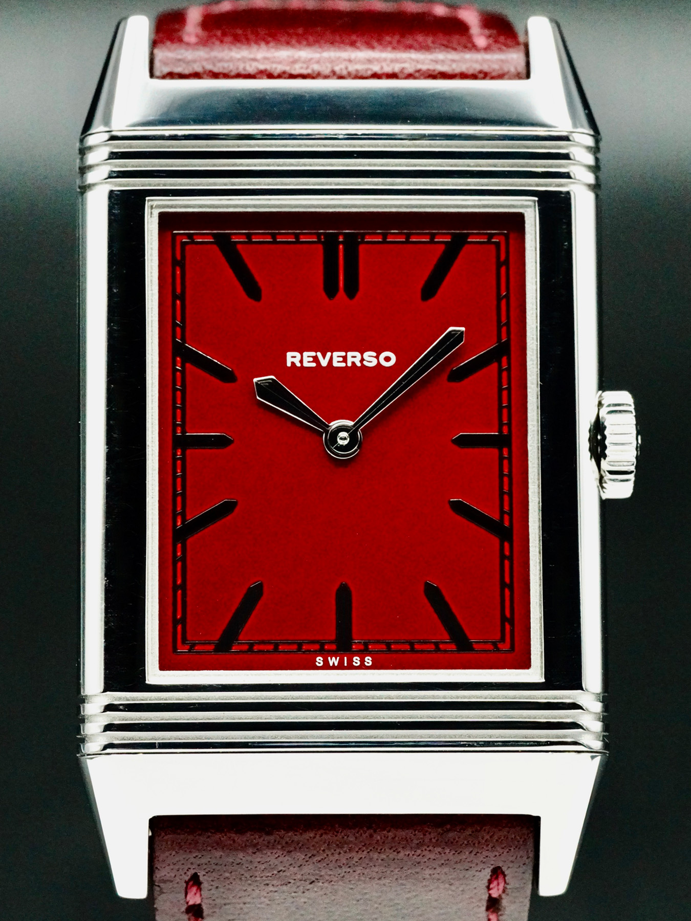 This watch features a 46.8mm x 27.4mm stainless steel case on leather strap. This watch also sports a red dial. Powered by a manual winding movement. Water resistance up to 30 meters.