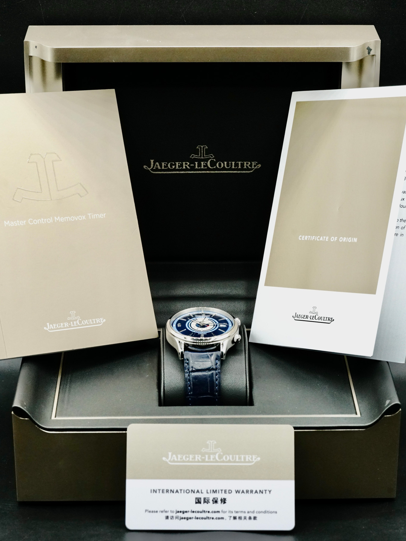 This Jaeger-LeCoultre Q410848J Master Memovox is in EXCELLENT condition. It has box and papers. This watch includes its original box, instruction manual, certificate of origin, and international limited warranty card dated for August 2020.