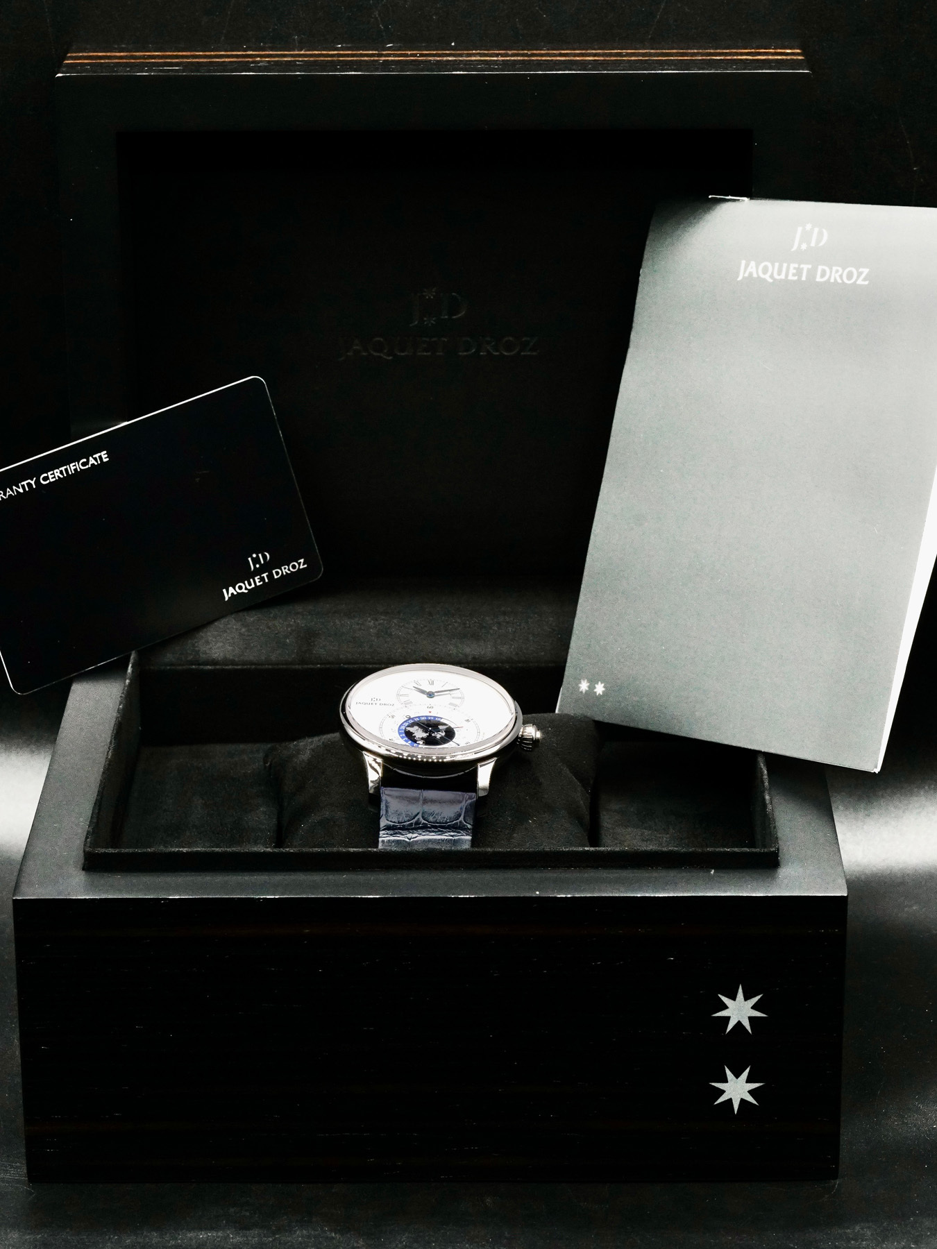This Jaquet Droz Grande Dual Time Silver J016030241 is in EXCELLENT condition. This watch includes its original box, instruction manual, and warranty certificate. No date on warranty card.