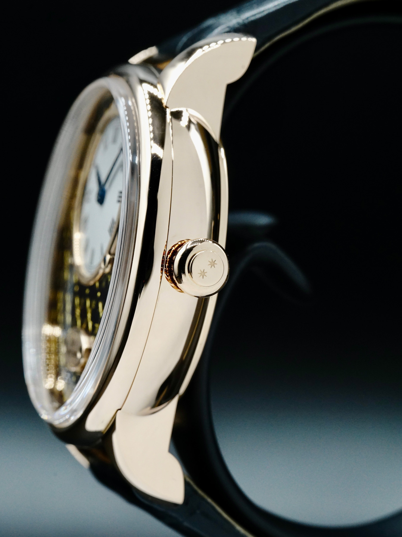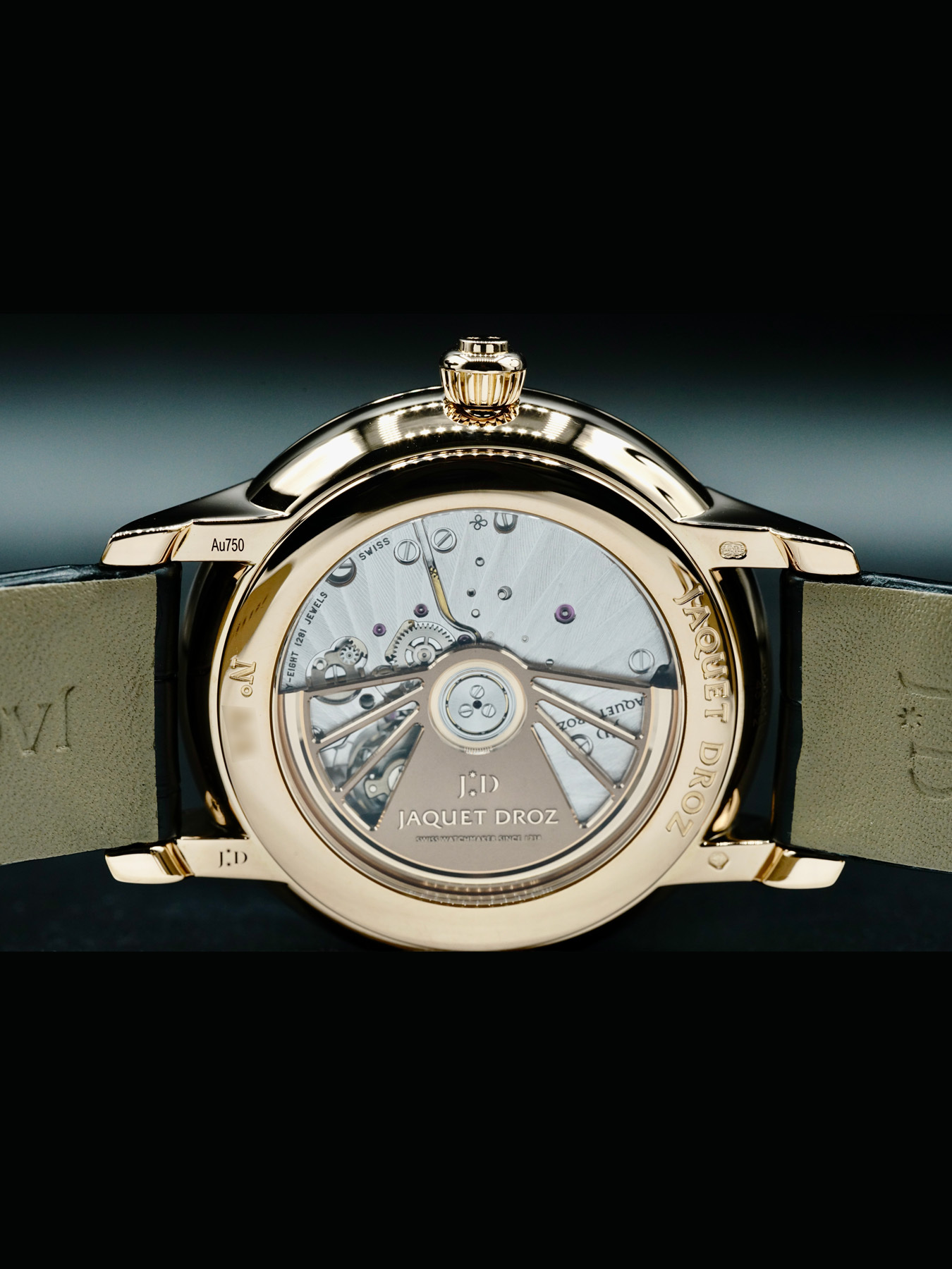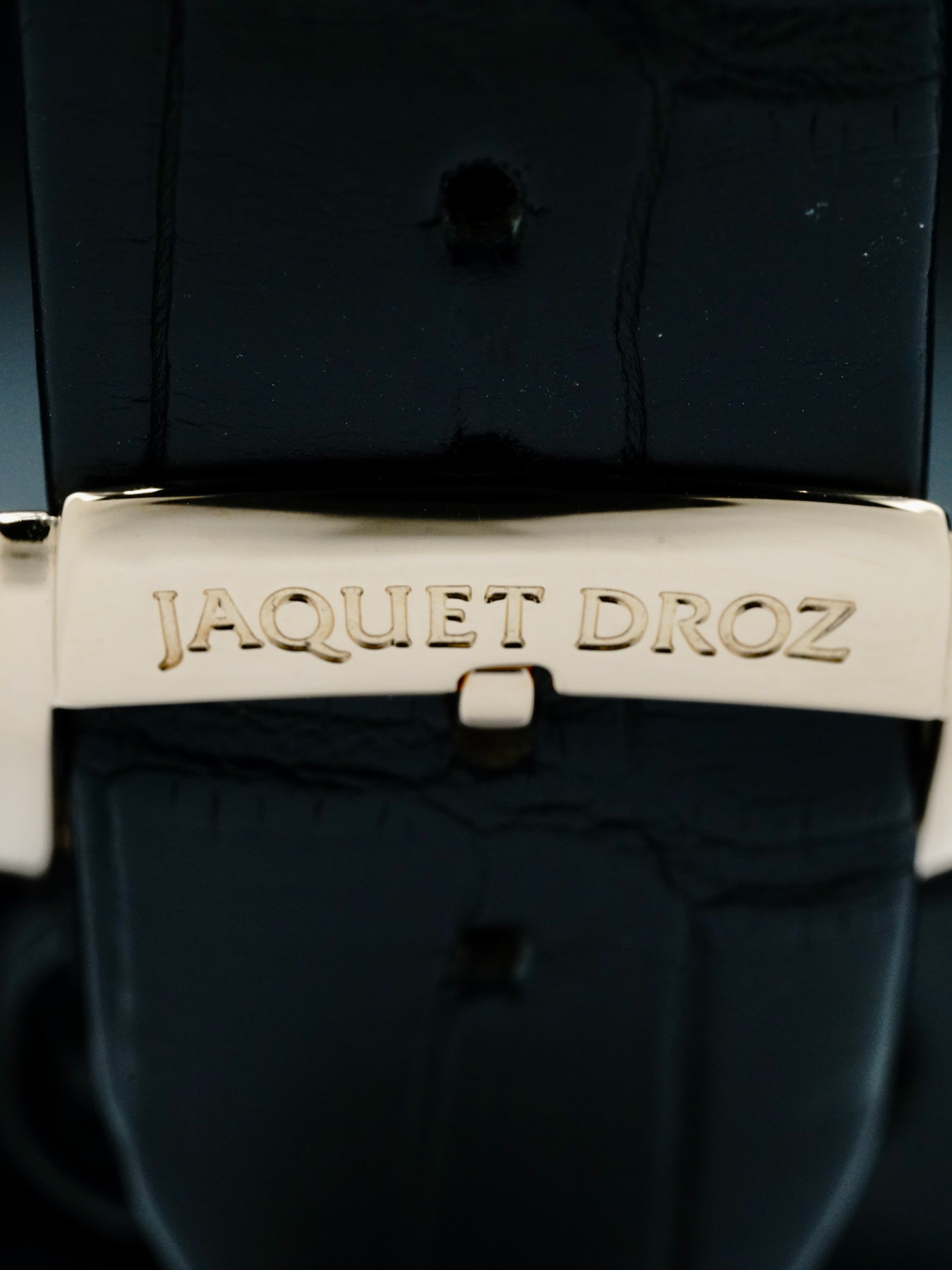 Powered by a Mechanical Automatic Movement, Caliber Jaquet Droz 2653.P. Water resistance up to 30 meters.