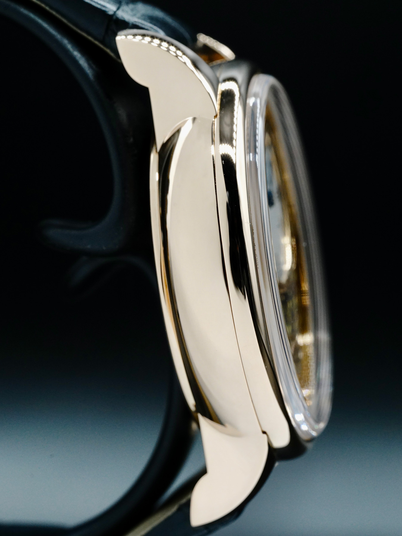 This Jaquet Droz Petite Heure Minute Paillonnee J005013245 features a 38mm 18k red gold case mounted on leather strap. This watch also sports a Paillonne in violet Grand Feu enamel dial.