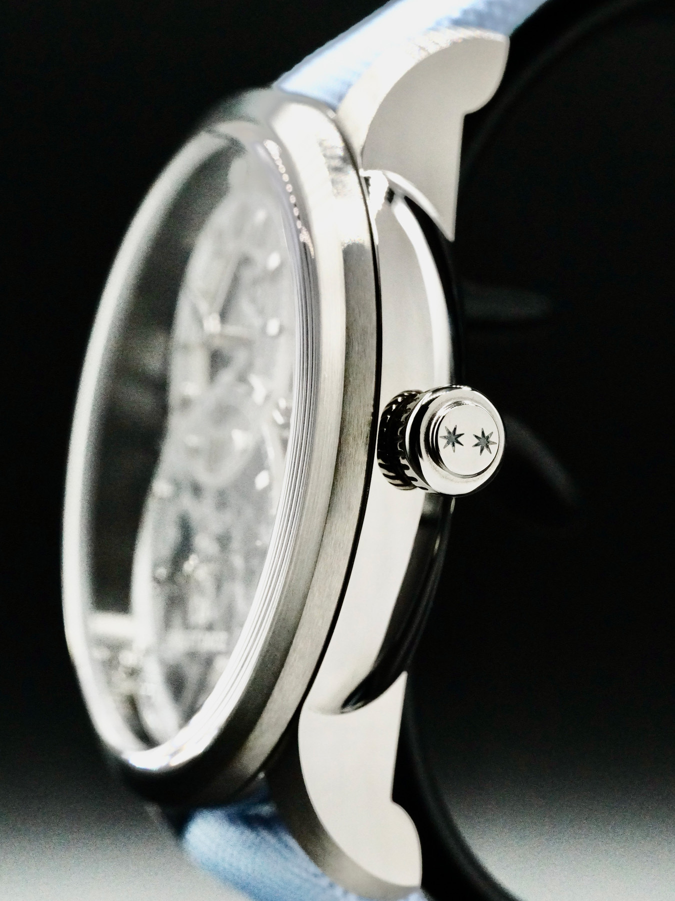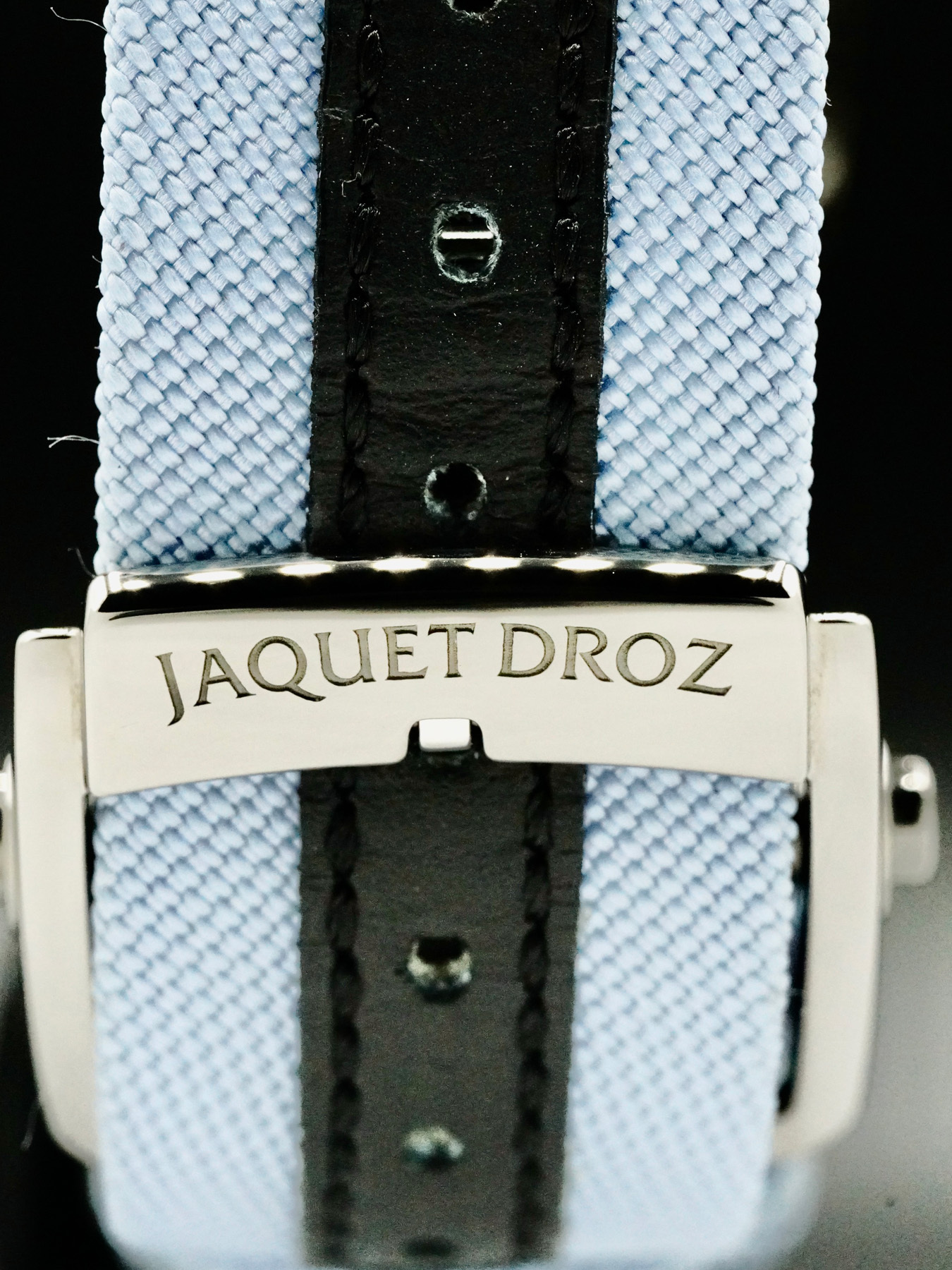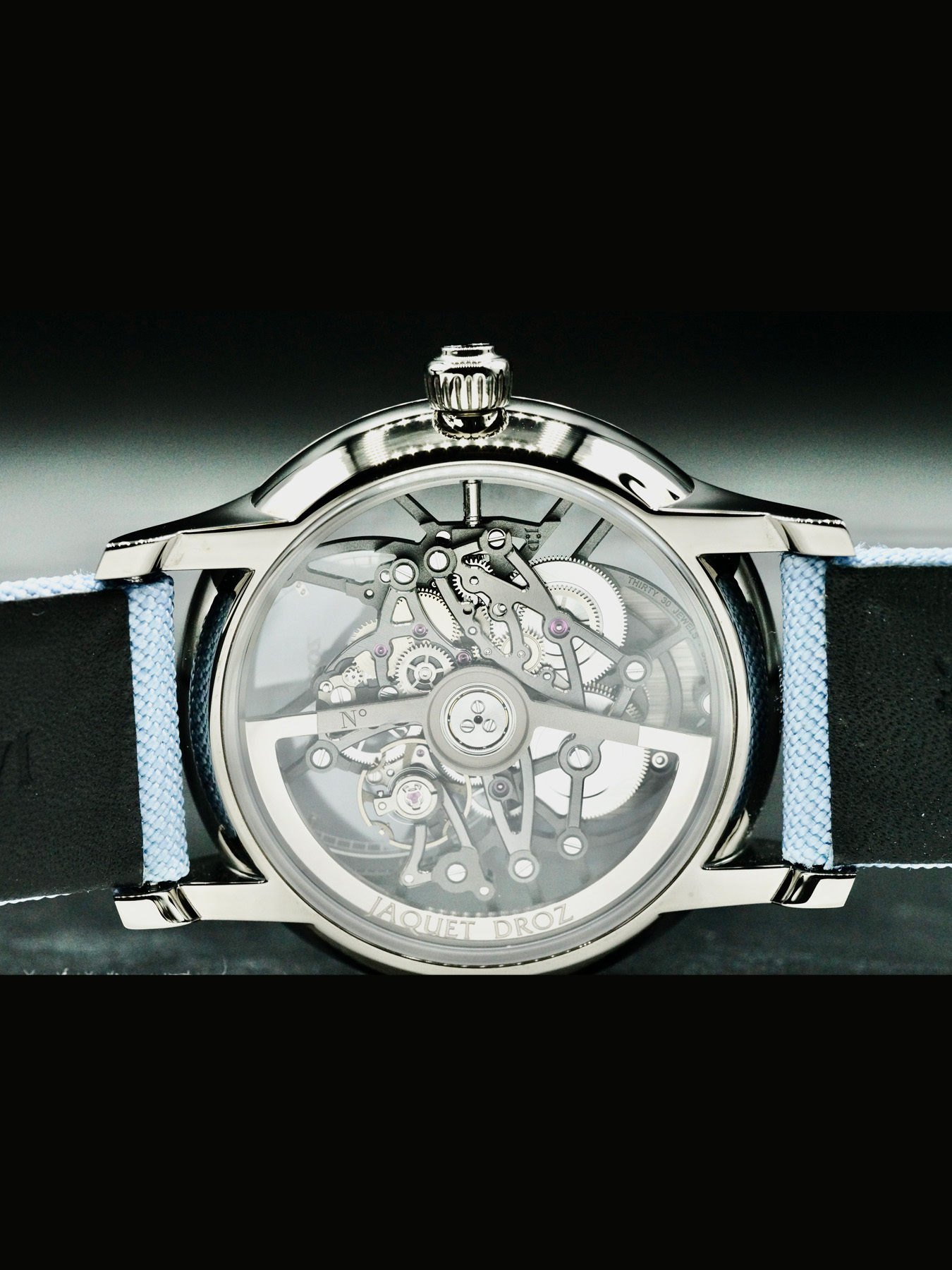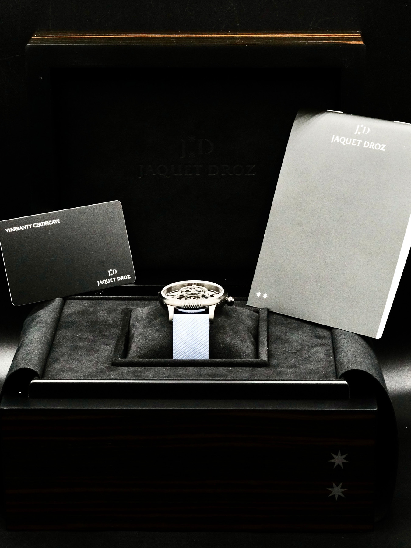 This Jaquet Droz Skelet-One Plasma Ceramic J003525542 is in EXCELLENT condition. This watch includes its original box, instruction manual, and warranty certificate dated for April 2023.