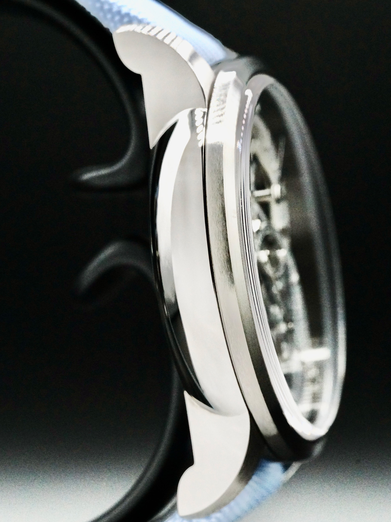 Sapphire dial with 18-karat white gold indexes. 18-karat white gold base with gray treatment. Plasma ceramic case. Self-winding skeleton mechanical movement. Power reserve of 68 hours. Diameter 41.5 mm.