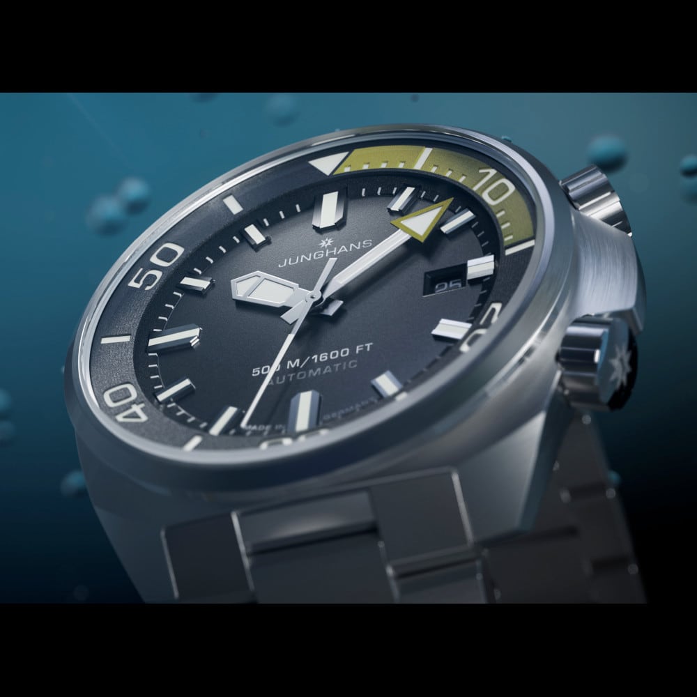The Aquaris Diver is engineered for true ocean explorers. Whatever you want to do 500 meters down below, the Aquaris Diver withstands the pressure. The inner rotating ring in combination with the minute hand featuring an arrow shape gives you a precise reading of your diving time. The metal bracelet with diver’s clasp offers versatility for a wide range of activities, featuring two extension options, a safety fold-over clasp, and Quick Release function. An additional strap made of synthetic rubber is included.