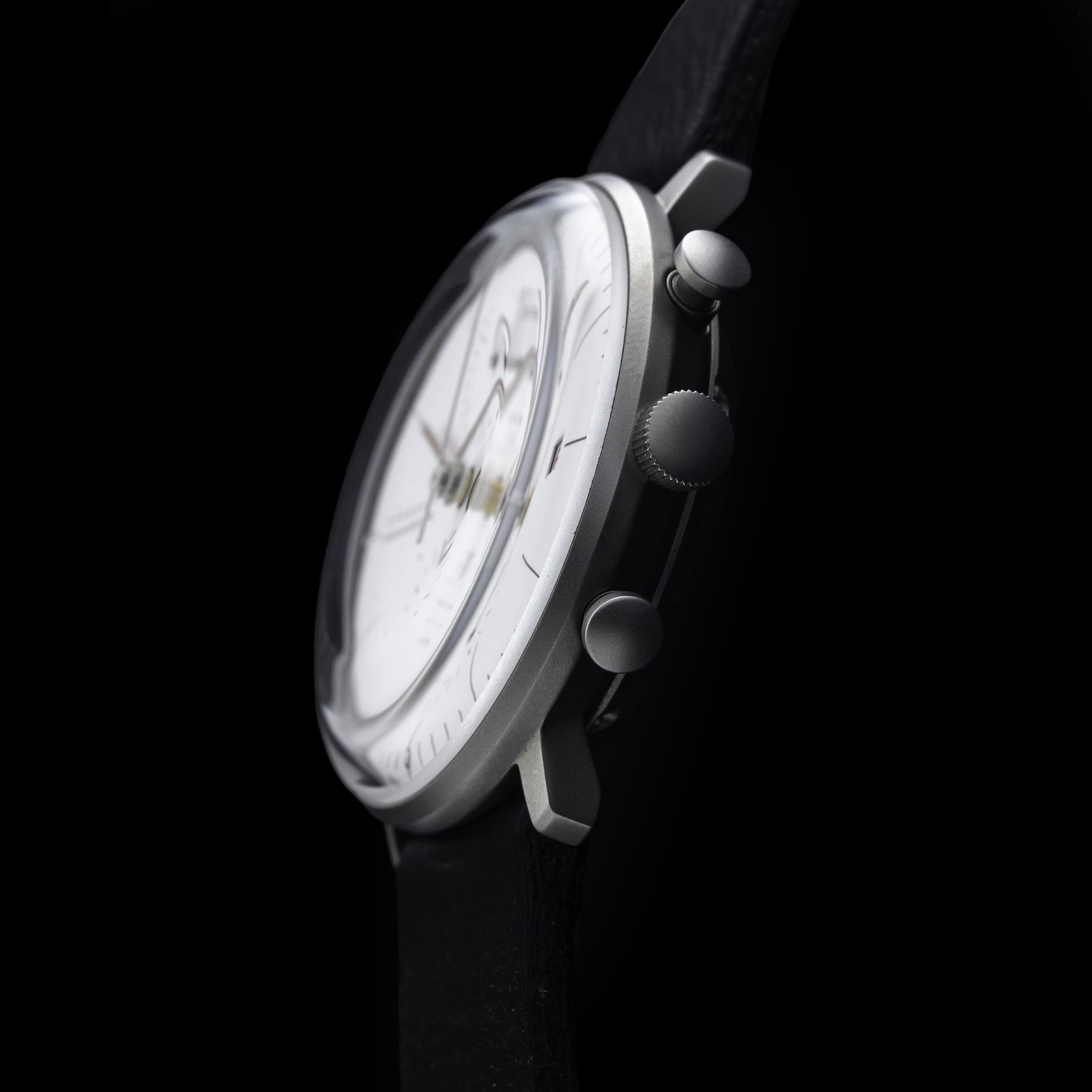 This watch features a 40mm stainless steel case on leather strap. This watch also sports a white dial. Powered by a mechanical automatic movement. Water resistance up to 50 meters.
