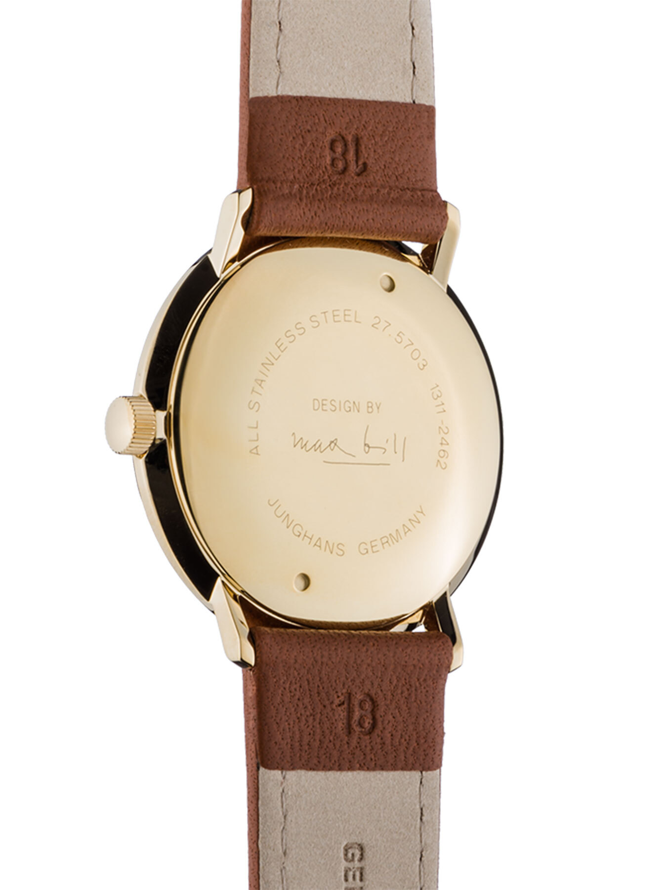 In 1961, Max Bill designed a range of mechanical wristwatches in collaboration with Junghans, and we continue to produce these watches practically unchanged today – from the puristic dial with the specially designed, distinctly rounded numerals, to the domed glass which emphasises the historical charm of the watch. If we weren’t able to improve on the design – we could certainly enhance both quality and comfort: This watch can now be retrofitted with sapphire crystal upon request.
