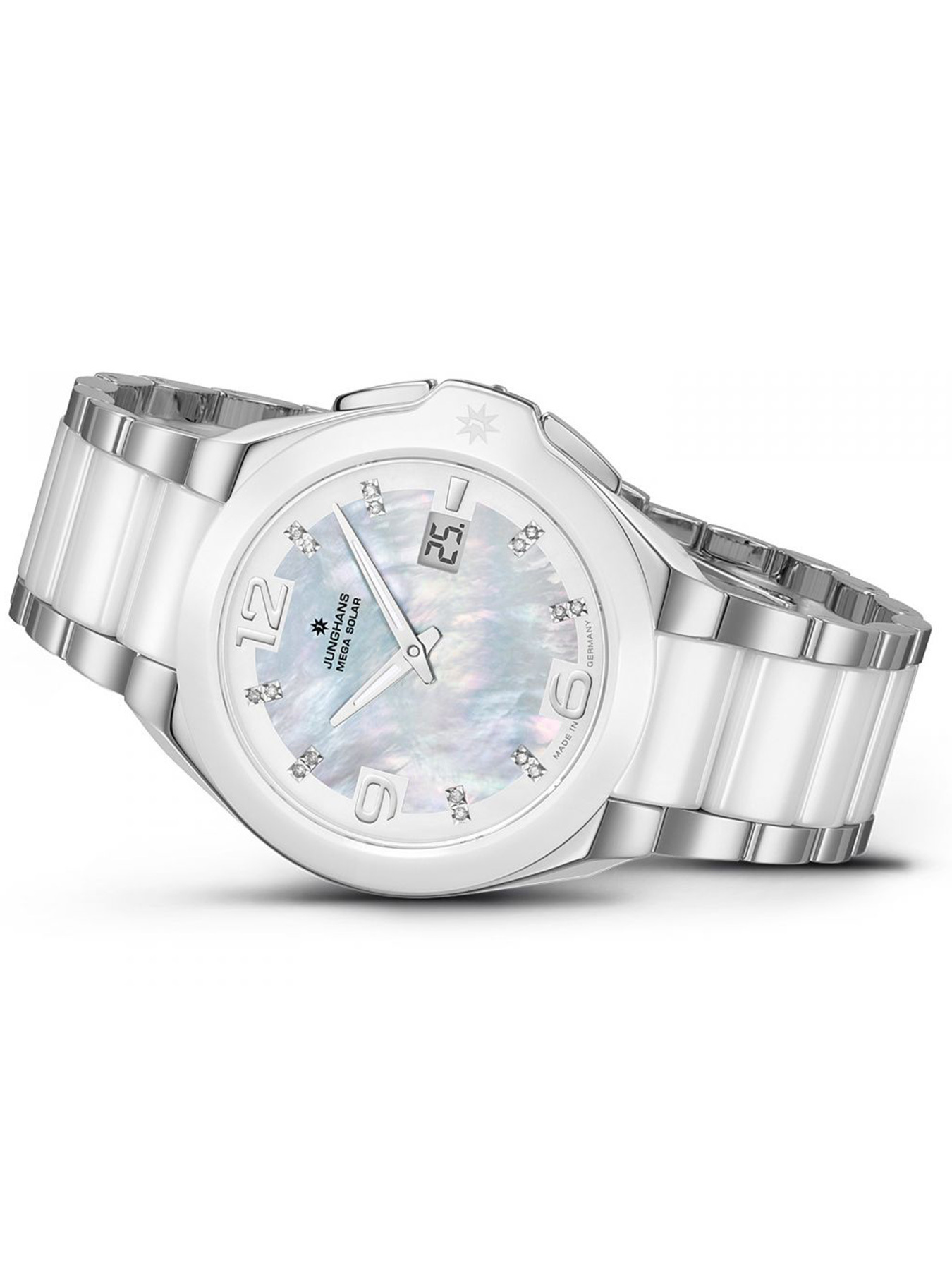 Cool stainless steel, scratch-resistant ceramics and waterproof up to 10 bar, the Spektrum Damen is our sportiest radio-controlled watch, designed to be worn by active and independent women. The Junghans multi-frequency radio-controlled movement guarantees ultimate precision, and is powered solely by the energy of the sun. Not only has the Spektrum Mega Solar proven itself to be incredibly accurate, but is also an extremely eco-friendly timekeeper requiring fewer resources and specially designed for a feminine wrist.