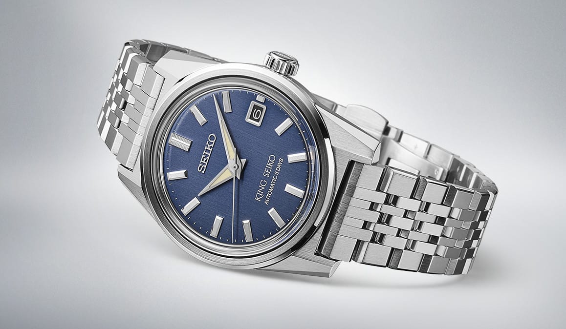 Inspired by the culture of the 1960s and 1970s, when King Seiko was in its original heyday, the dial comes in three colors: charcoal black, indigo blue, and olive green. Vertical hairline finishing on the dial expresses a vintage look.