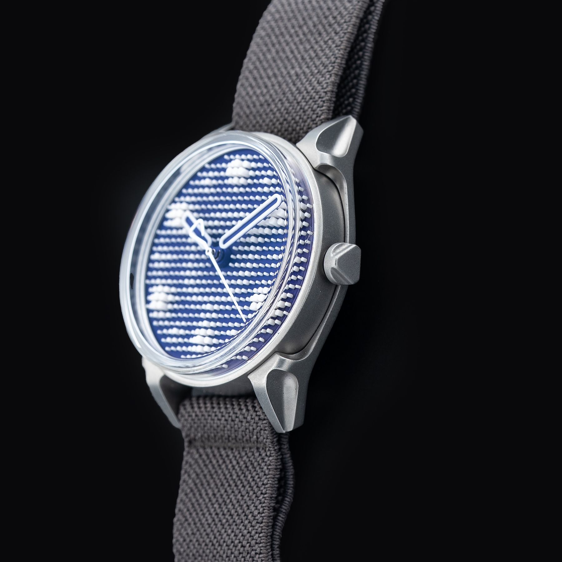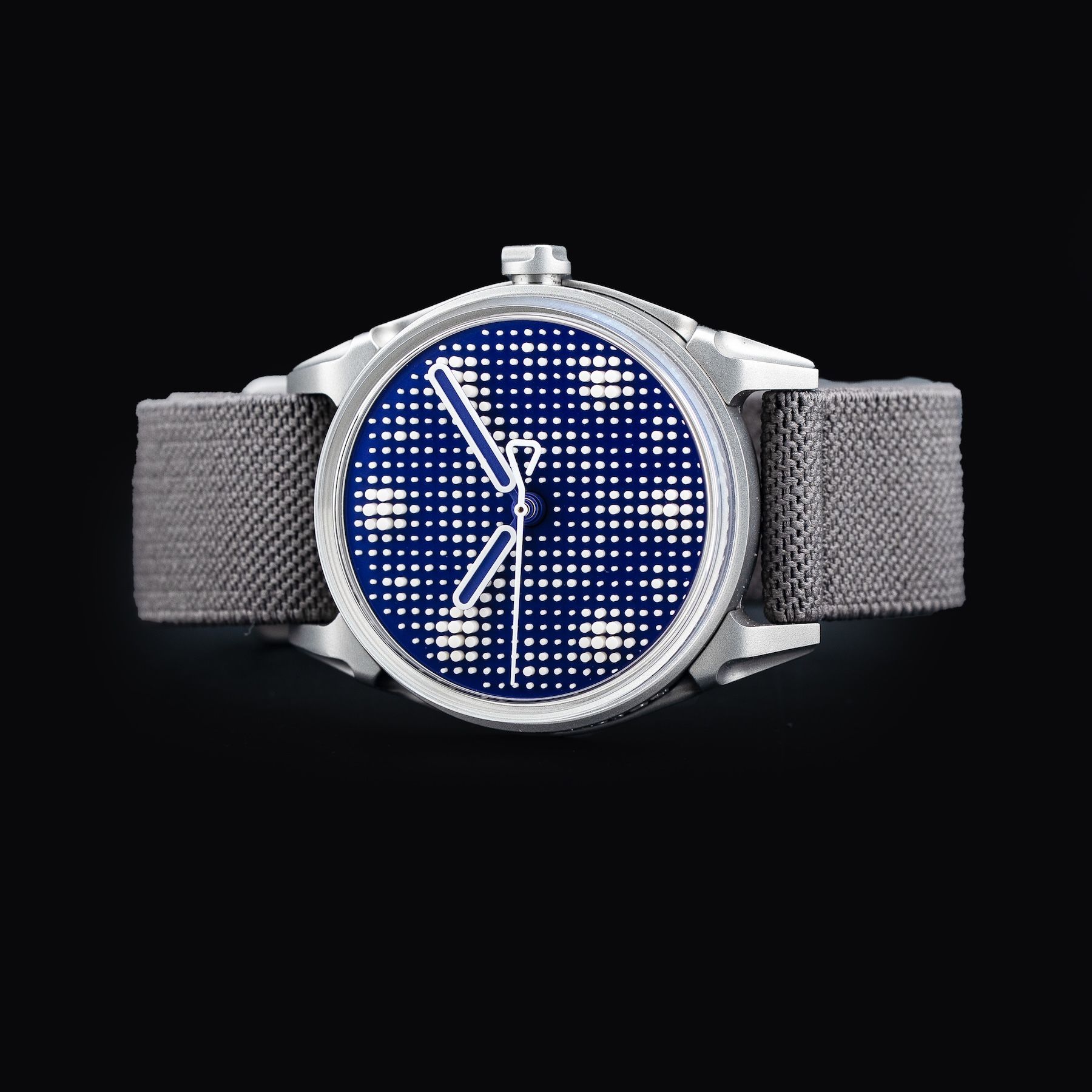 This watch features a 40mm steel case on textil strap. This watch also sports a violet dial. Powered by a La Joux-Perret G101 automatic movement. Water resistance up to 50 meters.