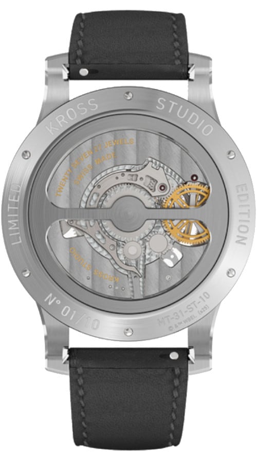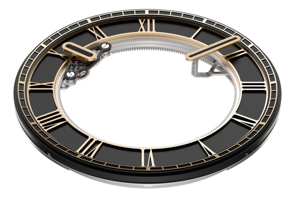 Winding the watch and setting the time are effortlessly achieved using a finger to rotate the flat "D-ring crown" on the case back and the "Time Set" push button, strategically positioned at 3 o'clock along the watch's edge. This system not only maintains design symmetry and enhances comfort compared to a traditional crown, but it also facilitates quicker winding, adding a practical touch to the overall experience.