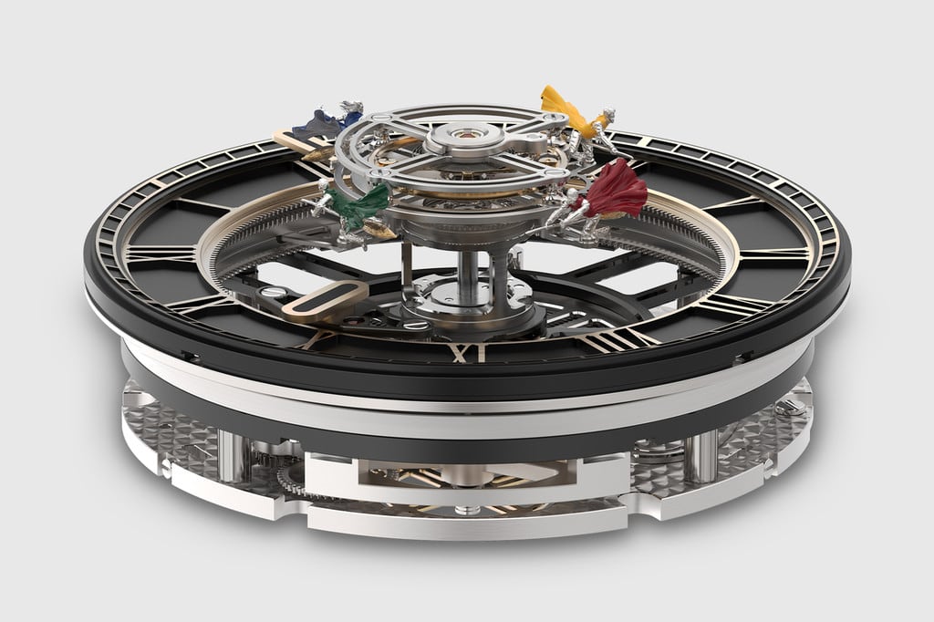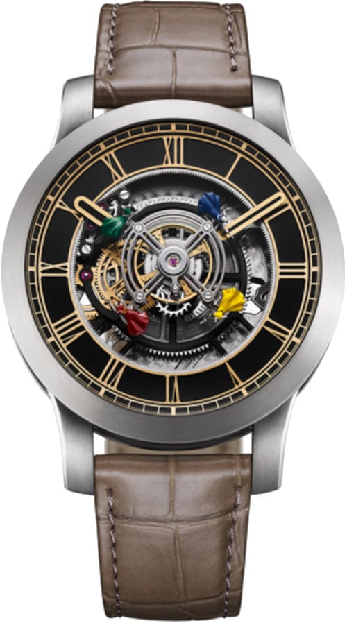This unique design allows the barrel to occupy nearly the entire movement surface, providing an impressive 120-hour power reserve while maintaining exceptional chronometric performance. The tourbillon, its balance wheel, and fixed seconds wheel are elevated above the movement and hands, floating over the barrel.