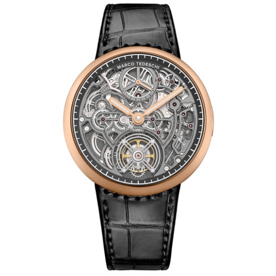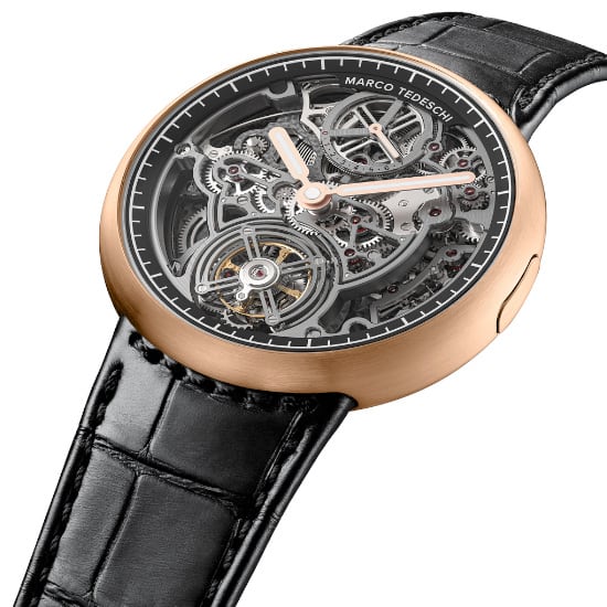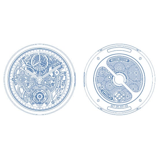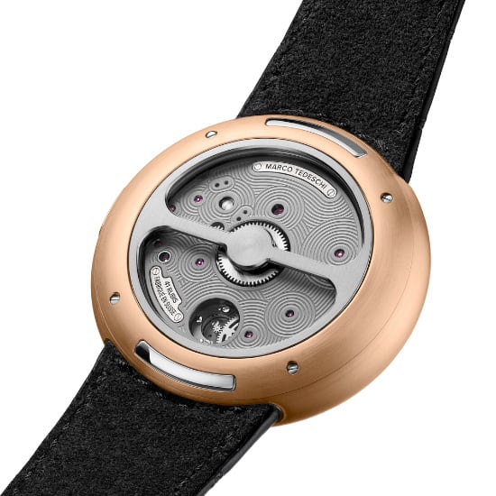 The front is fully open. The movement explains itself instantly. The mechanics revealed with intent. An openworked movement designed that way from the start. Legible, functional, aesthetical. Light, geometry and finishing reveal functions. Every component is hand-finished. The back is the opposite. An architecture closed by design, defined by intent. A single transversal bridge gives space to a pure canvas for Marco Tedeschi’s signature decoration: concentric geometries, circular patterns, flowing in repetition. A Zen aesthetic, engineered with precision.
