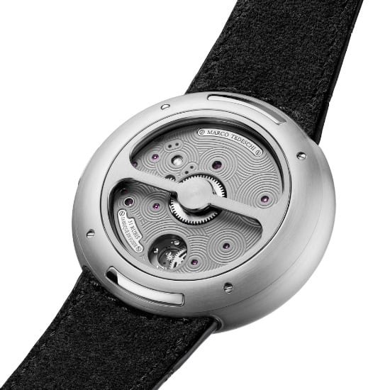 The front is fully open. The movement explains itself instantly. The mechanics revealed with intent. An openworked movement designed that way from the start. Legible, functional, aesthetical. Light, geometry and finishing reveal functions. Every component is hand-finished. The back is the opposite. An architecture closed by design, defined by intent. A single transversal bridge gives space to a pure canvas for Marco Tedeschi’s signature decoration: concentric geometries, circular patterns, flowing in repetition. A Zen aesthetic, engineered with precision.