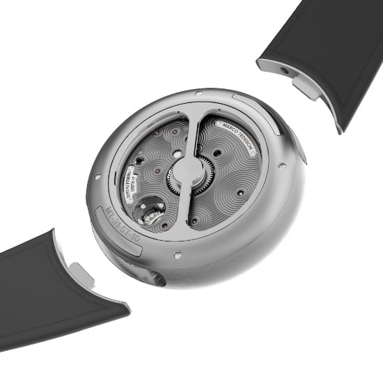 The strap is integrated into the case architecture and released via pushers on the case back. It keeps the design clean, uninterrupted and fully integrated into the case pure roundness geometry. Function is hidden. Aesthetic is preserved. No visible complexity on the dial side. No unnecessary hardware. One press. One release.