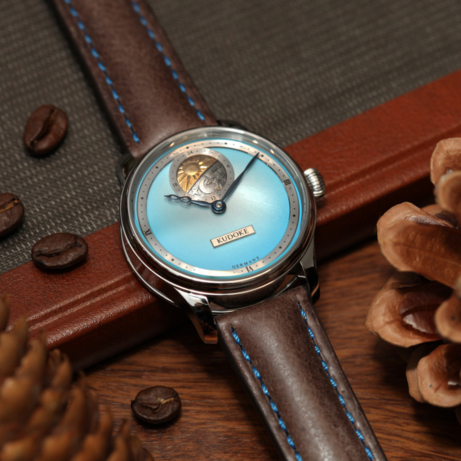 The dial continues the artistic line of the first model, juxtaposing Roman and Arabic numerals on the rhodium-plated chapter rings. Another eye-catcher is Stefan’s hallmark infinity hour hand – the symbol of time itself. Here the KUDOKE 2 expressly decelerates and relaxes the experience of time here with the omission of a seconds hand.