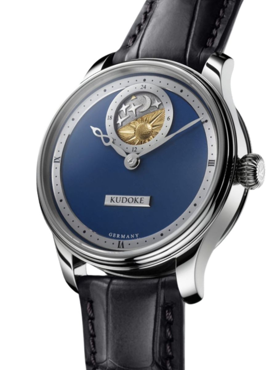 The dial continues the artistic line of the first model, juxtaposing Roman and Arabic numerals on the rhodium-plated chapter rings. Another eye-catcher is Stefan’s hallmark infinity hour hand – the symbol of time itself. Here the KUDOKE 2 expressly decelerates and relaxes the experience of time here with the omission of a seconds hand.
