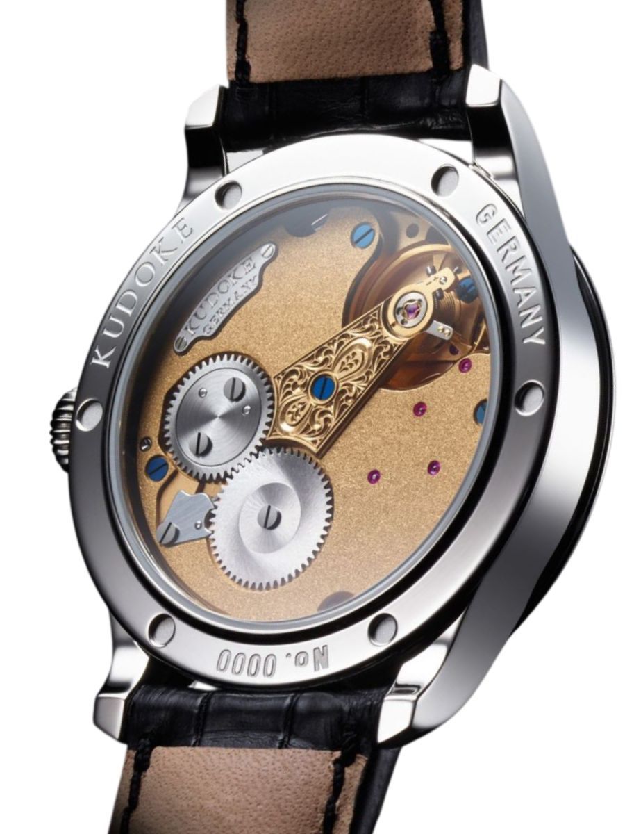 At its core is the in-house Kaliber 1 hand-wound movement, meticulously finished with frosted surfaces, polished bevels, and a hand-engraved balance cock featuring Kudoke’s signature infinity symbol. Visible through the sapphire case back, the movement embodies the brand’s dedication to artisanal mastery.