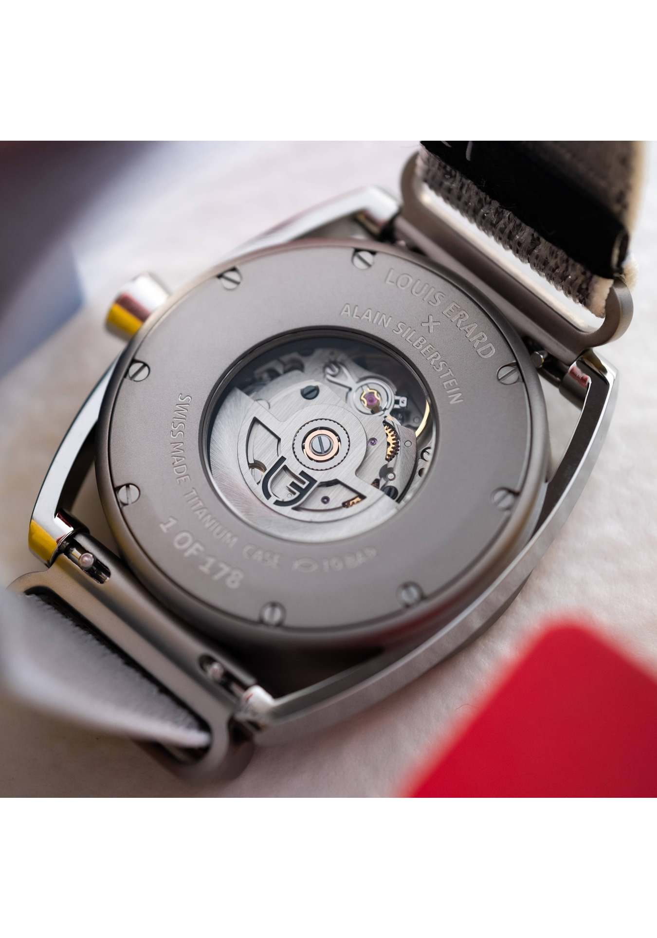 Alain Silberstein signature hands: red lacquered hour hand, blue lacquered minute hand and yellow lacquered second hand