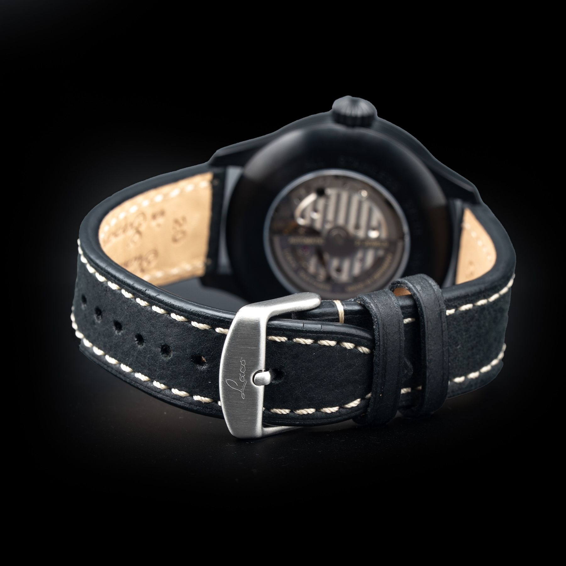 - This timepiece features a 42mm steel case paired with a high quality leather strap. It showcases a distinctive black dial and is powered by a precise automatic winding movement. The watch is designed with a water resistance of up to 50m.