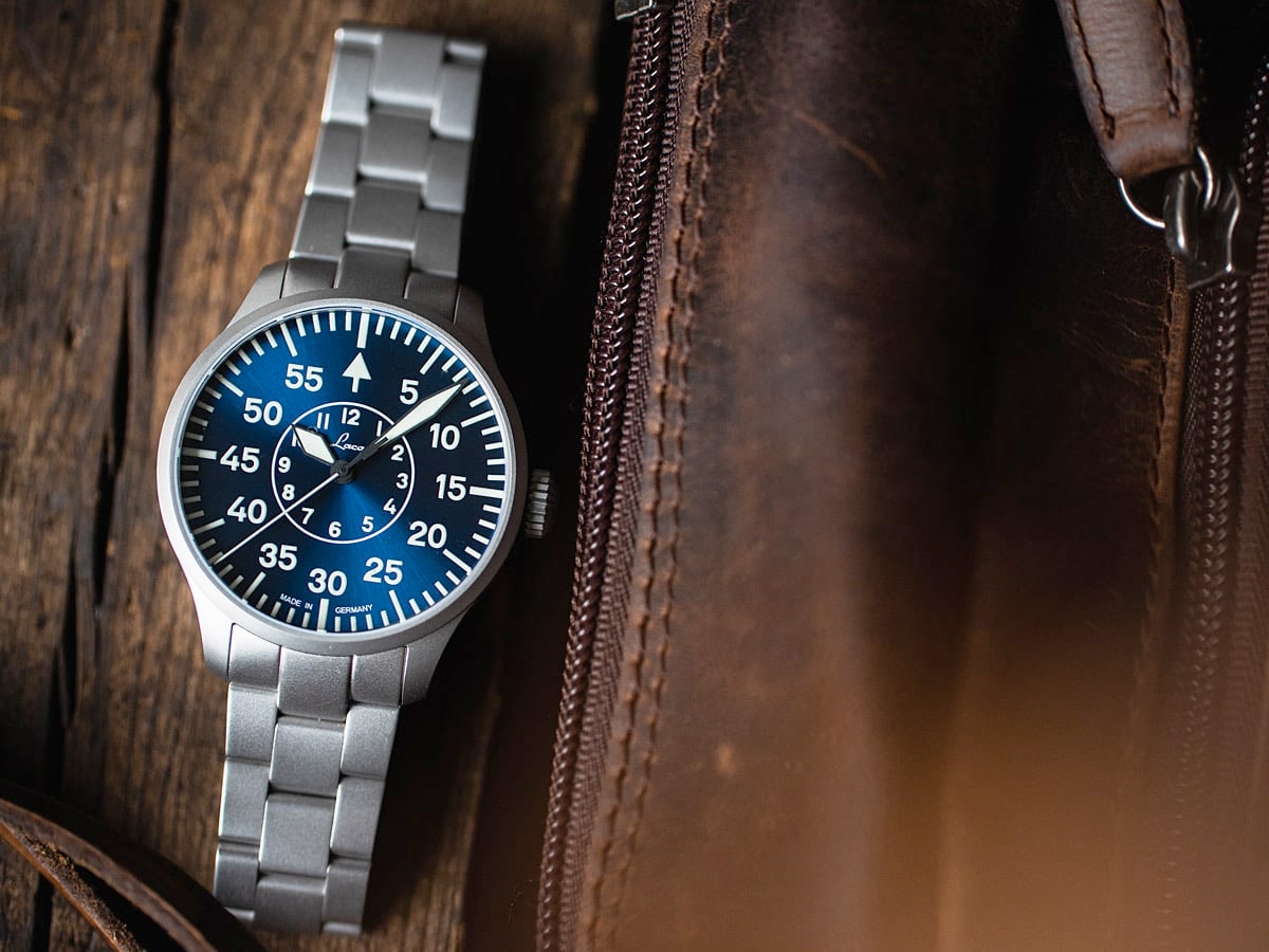 Introducing the Laco Pilot Watch Aachen Blaue Stunde 42 MB watch, a masterpiece of style and precision. Crafted with a stainless steel case, exhibition case back, and sapphire crystal, this timepiece offers exceptional durability and a clear view of its intricate mechanics. The captivating blue dial, adorned with luminous hands and Arabic numerals, adds an air of elegance. Equipped with a reliable Laco 2S automatic movement based on the Miyota 82S0, it ensures accurate timekeeping. With a water resistance of 50m and a comfortable sandblasted stainless steel bracelet secured by a folding clasp, it is designed for both practicality and comfort. Enjoy a 2-year warranty and indulge in the unmatched craftsmanship of Laco, a renowned brand synonymous with excellence. Elevate your style with the Laco Pilot Watch Aachen Blaue Stunde 42 MB, a true embodiment of timeless sophistication.