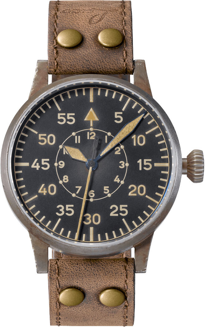 Inspired by the original 55 mm sized observation watches from the 1940s, this collection's models look as if they have been worn over several generations. The hand made "Erbstück" watch is a one of a kind. Traces of ageing give these timepieces a historic charm that usually can only be found at vintage models.