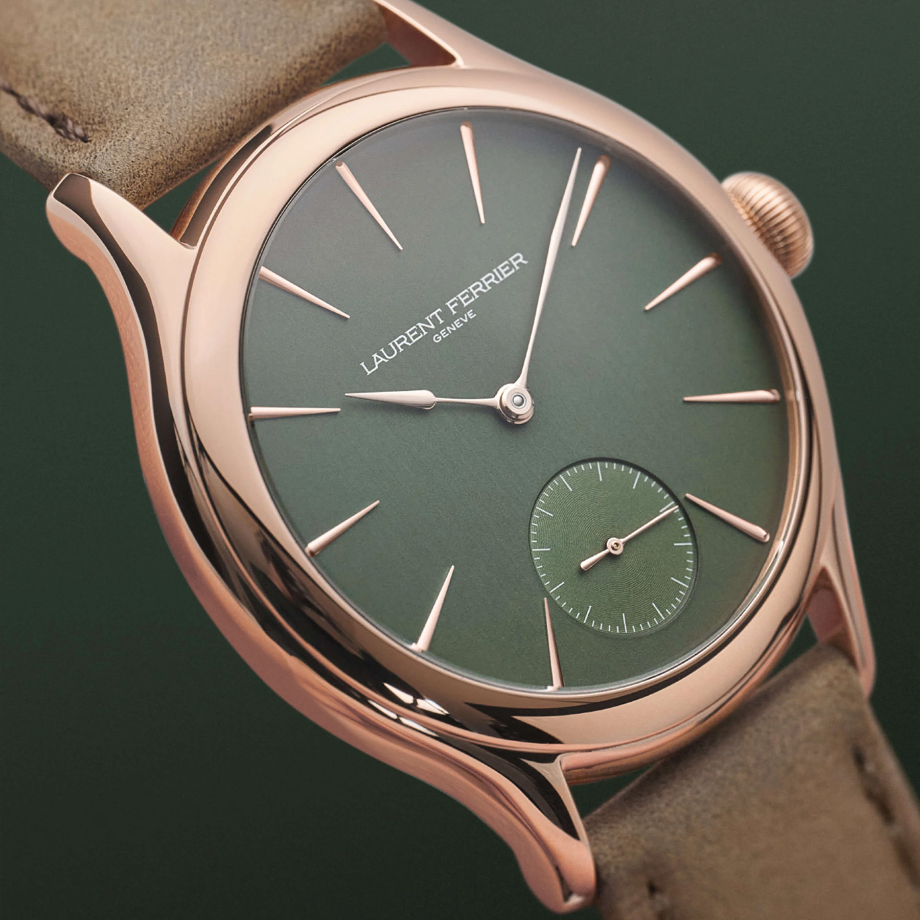 The term ‘Evergreen’ combines timeless character with the associations of the colour green: a shade deeply connected with nature, growth and renewal. Embodying these principles, the latest interpretations of the Micro-Rotor evoke this enduring elegance. The curve of the solid red gold case reflects the pure, restrained LAURENT FERRIER style. It echoes the smooth pebble shape of the understated and sophisticated models of 19th century horological history, and particularly that of pocket watches.