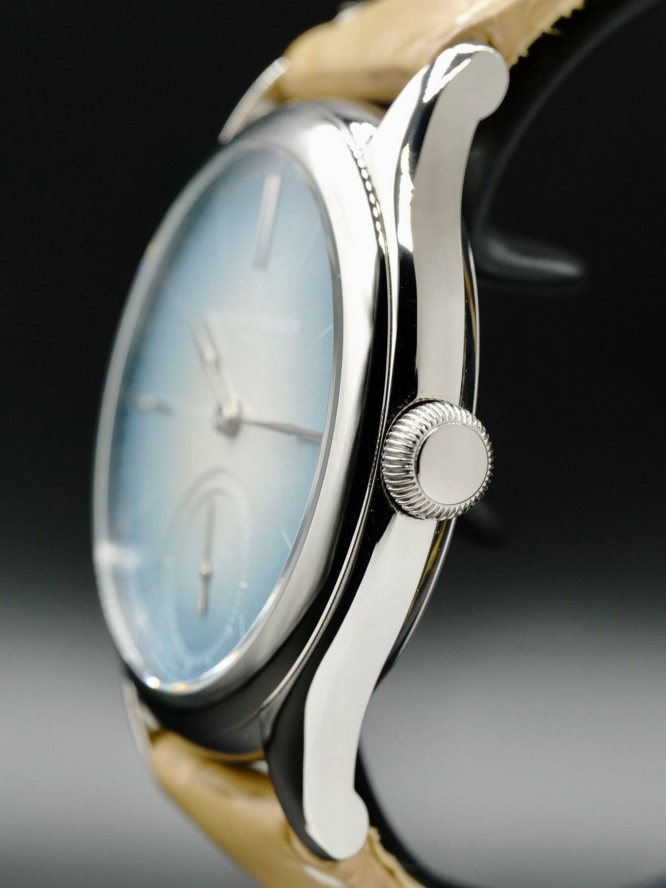 This Laurent Ferrier Classic Origin features a 40mm Grade 5 titanium case with a transparent case back on a tan leather strap with a titanium tang buckle. This watch also sports a blue gradient dial with 18k white gold hands and index dial markers covered by scratch resistant sapphire crystal.
