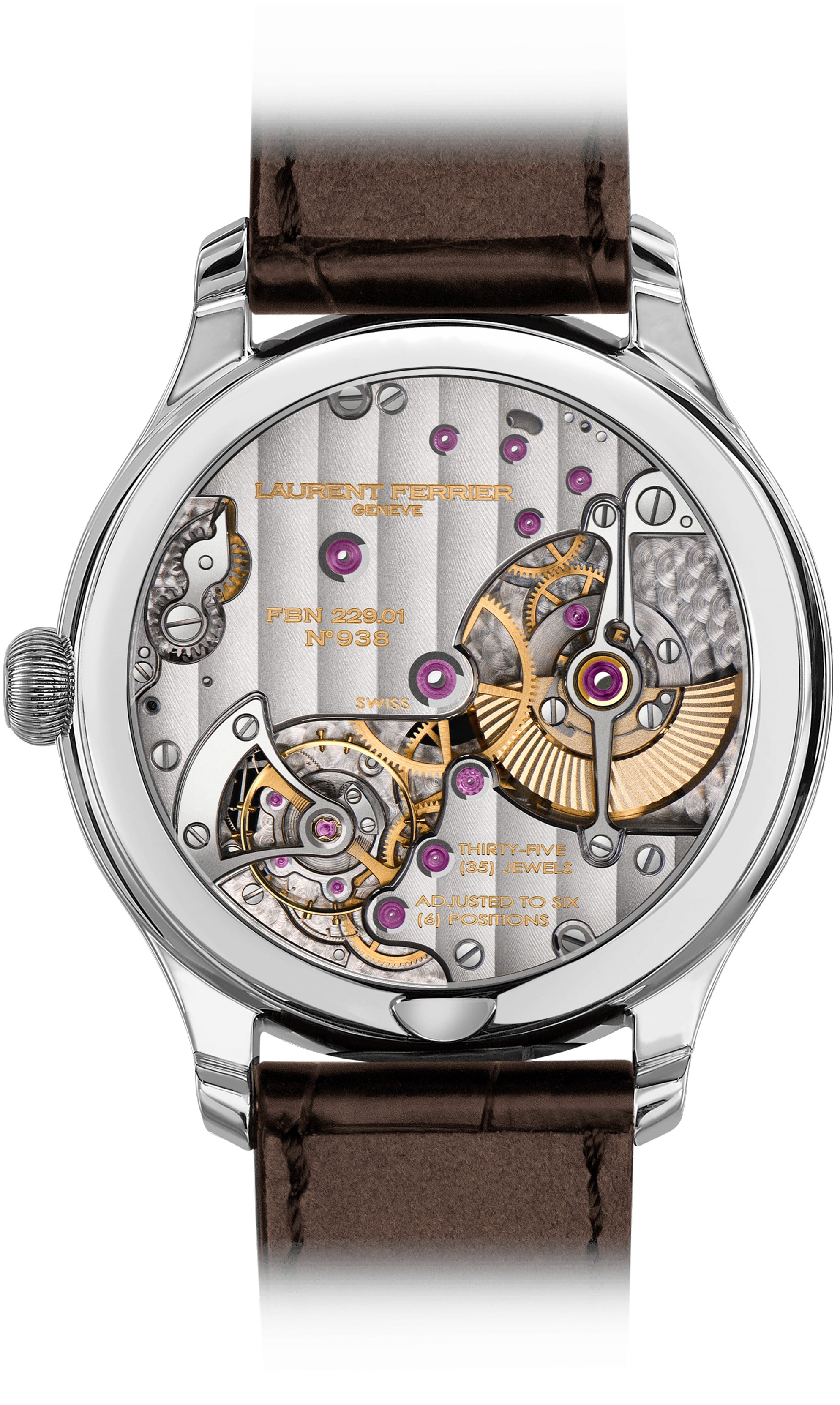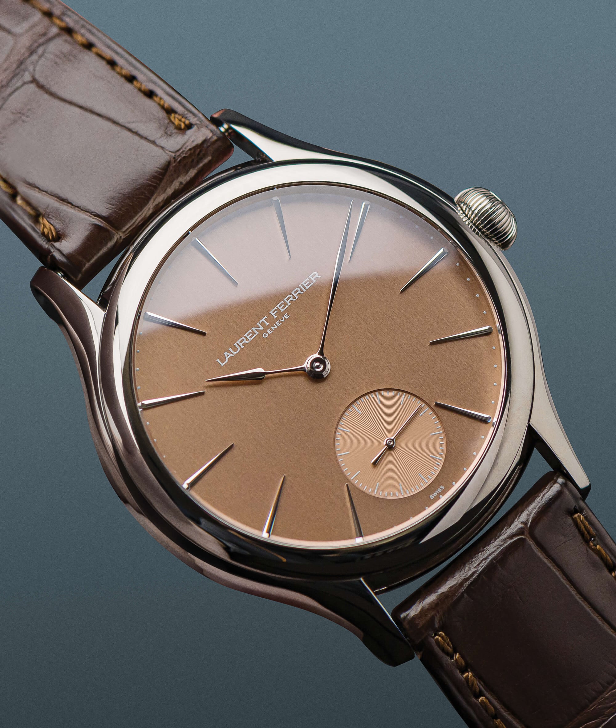 Laurent Ferrier treats its Classic Micro-Rotor with a natural escapement calibre with an autumn 5N red gold-toned colour, with copper glints thanks to the vertical satin-brushed finish. This dial also features the 11 typical drop-shaped white gold hour-markers. This distinctive look, which combines a vintage style by its colour and a contemporary appearance with a well-kept design, is complete by a chestnut coloured leather strap.