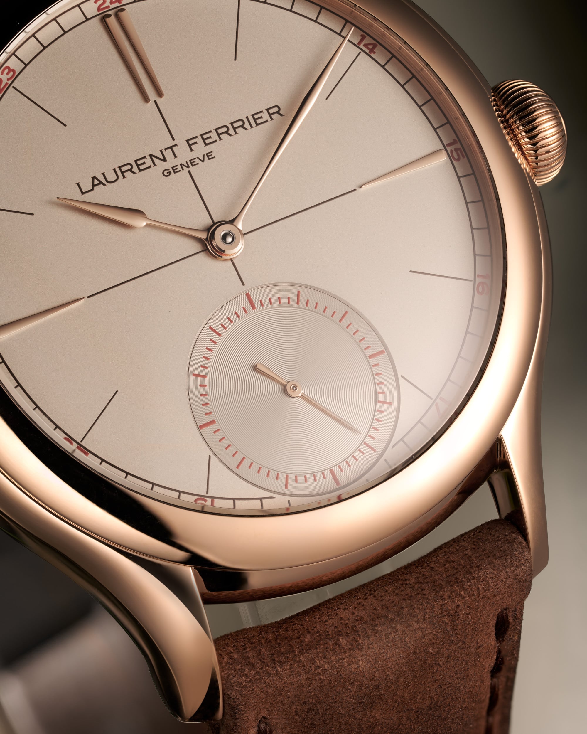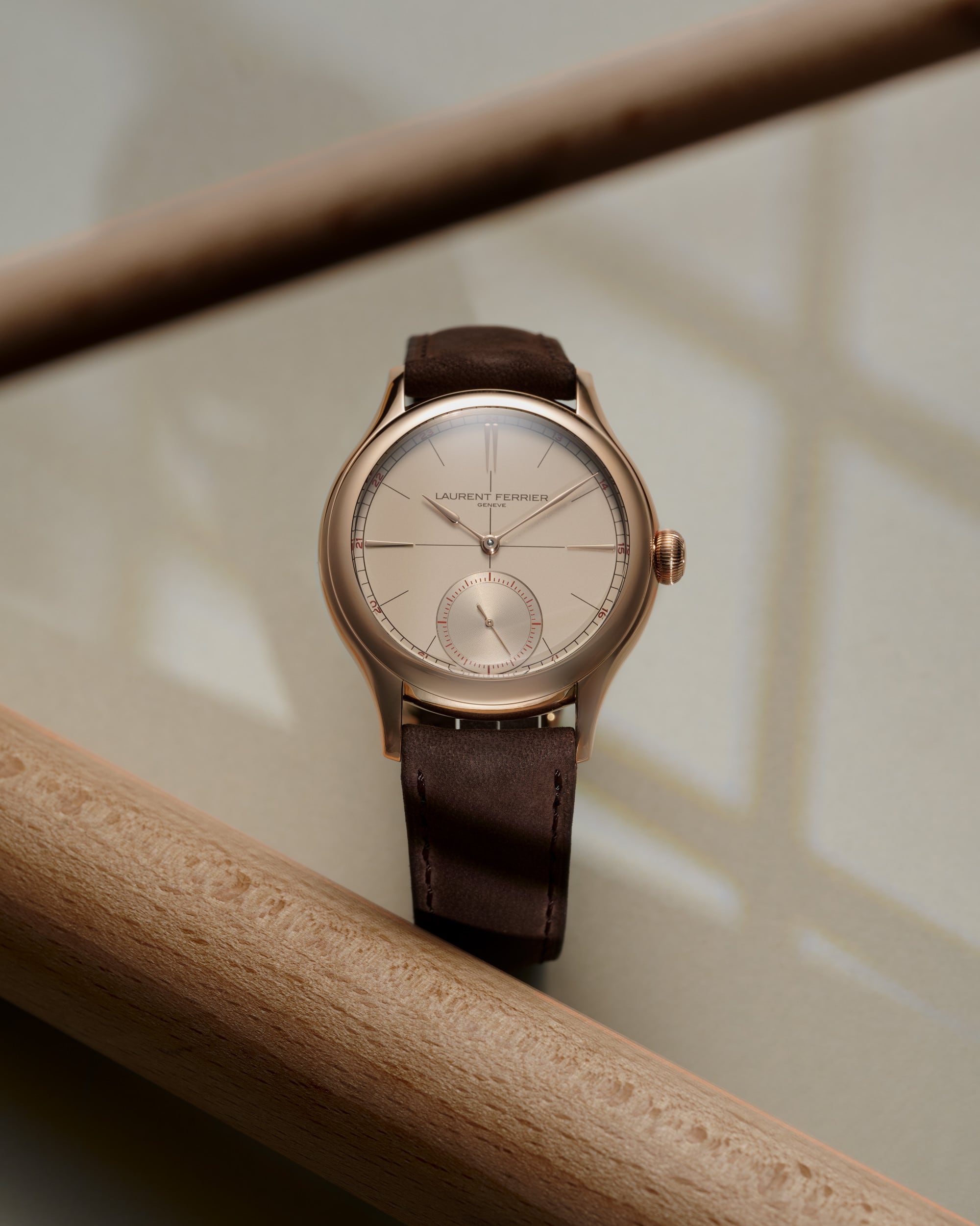 More than any other, the Classic Origin Beige embodies the minimalist spirit so dear to Laurent Ferrier. Its beige dial, infused with warm undertones, pulses to the rhythm of the brown railway track, central cross and hour marker transfers. Legibility, a value deeply cherished by the Genevan watchmaker, is ensured by the minute track punctuated with red numerals, mirroring the accents on the small seconds at six o’clock. At the centre, the signature 18k gold Assegai hands glide across the opaline surface with a serene elegance, as if already familiar with the story of time they reveal.