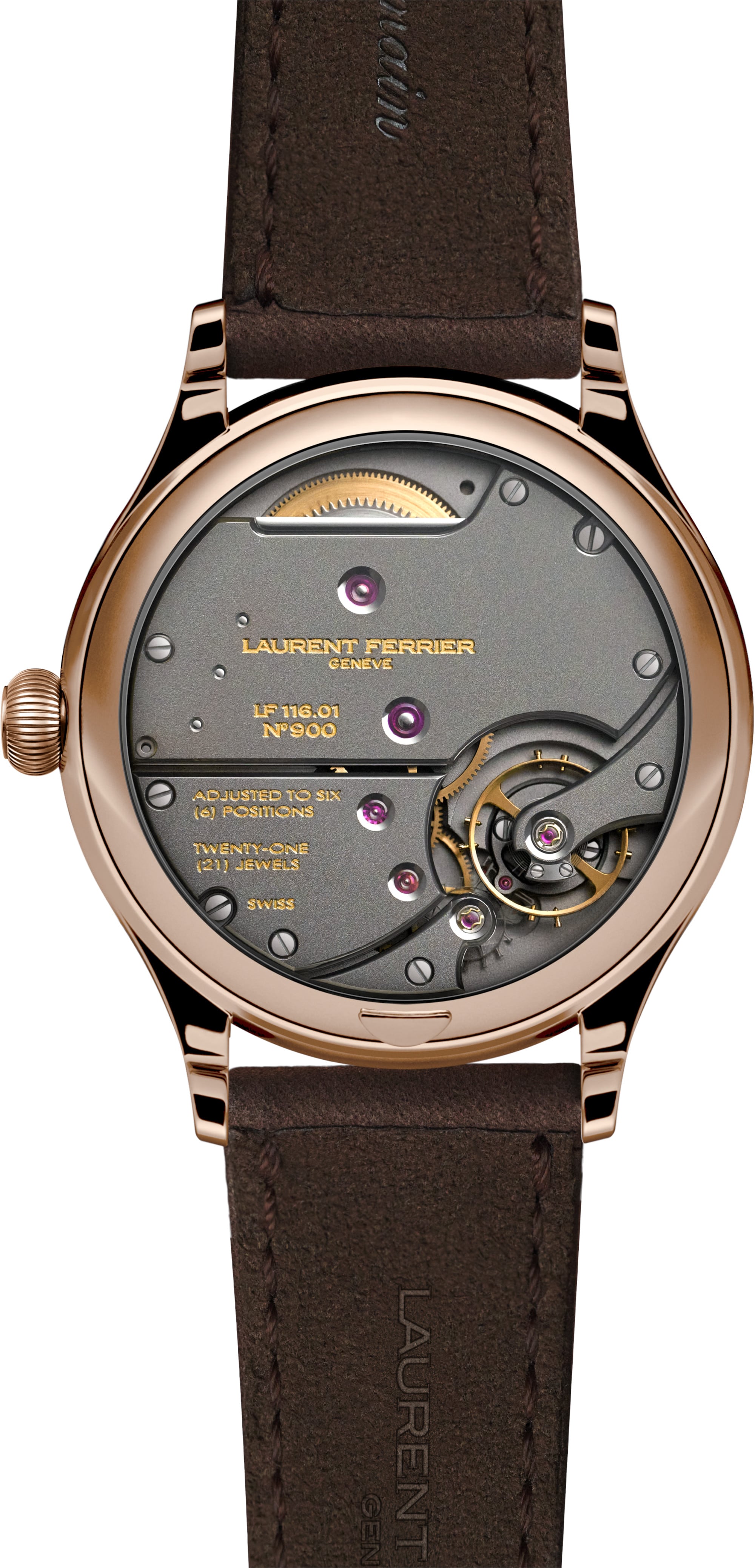 Completing this harmonious ensemble is a mocha nubuck strap lined with Alcantara. Its 5N red gold pin buckle echoes the case with warmth and elegance, manifesting the spirit of the piece down to the finest detail.