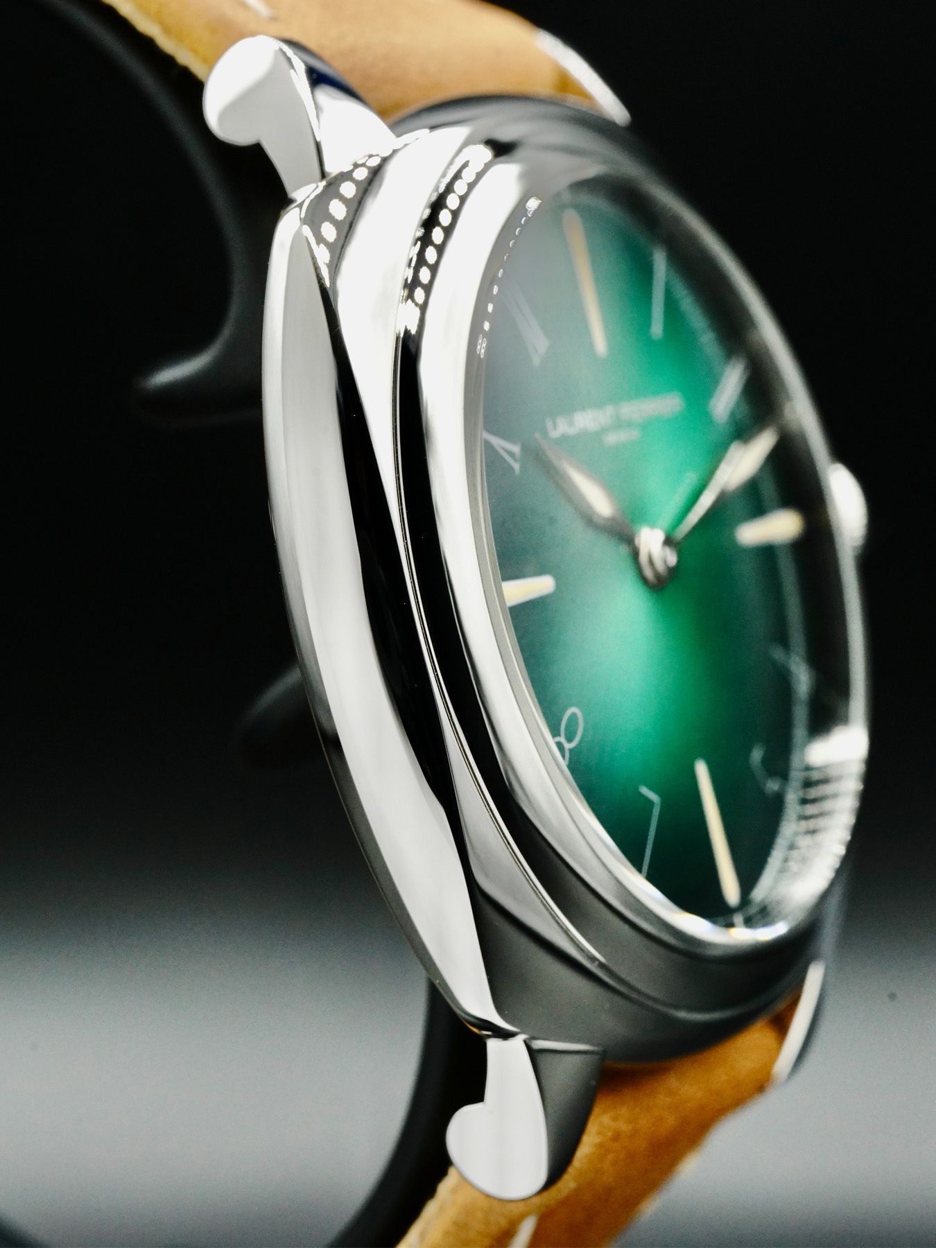 This Laurent Ferrier Square Motor-Rotor features a 41mm stainless steel case with a transparent case back on a brown leather strap. This watch also sports a green gradient sunburst dial with 18k white gold beige superluminova hands and index dial markers covered by scratch resistant sapphire crystal.