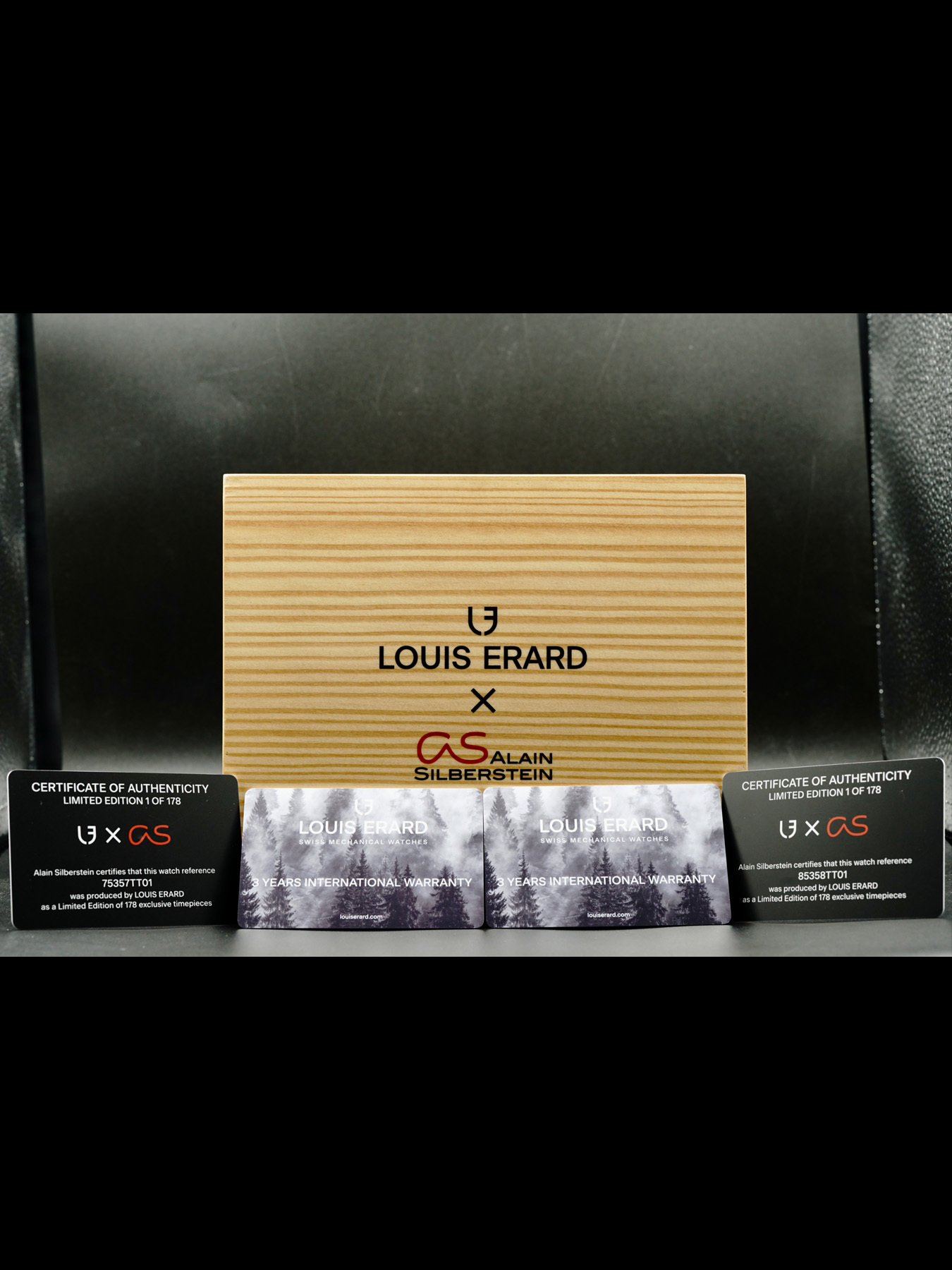 This Le Diptyque Louis Erard x Alain Silberstein diptych-set is in EXCELLENT condition. These watches include the box, both certificates of authenticity, and both 3 year international warranty cards dated for June 2022. Limited to 28 sets.