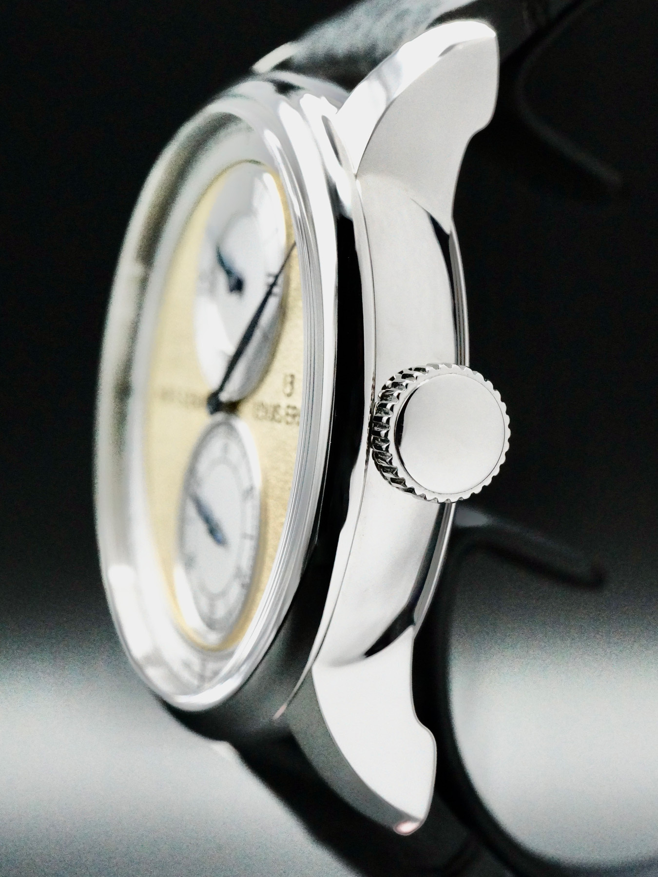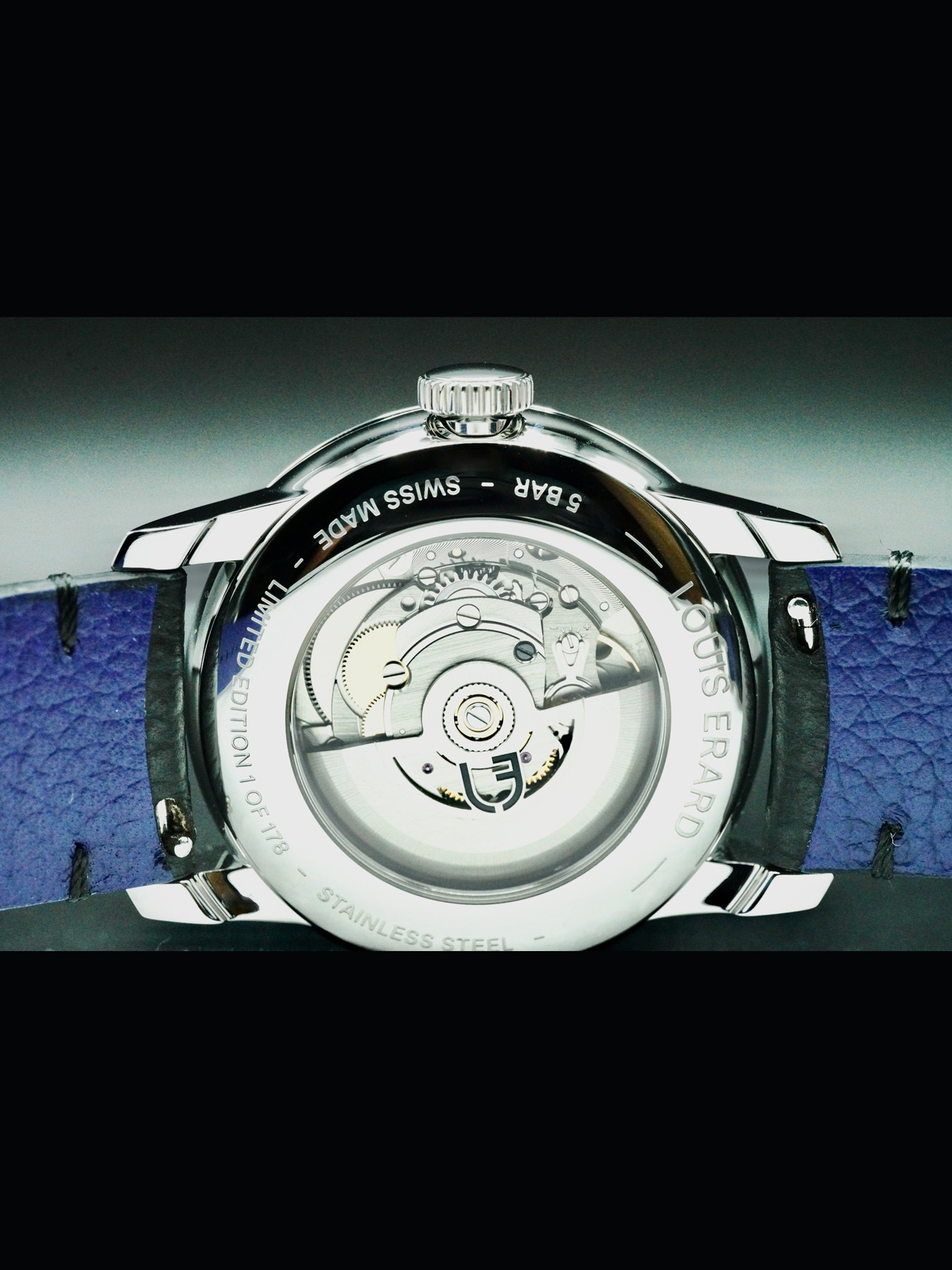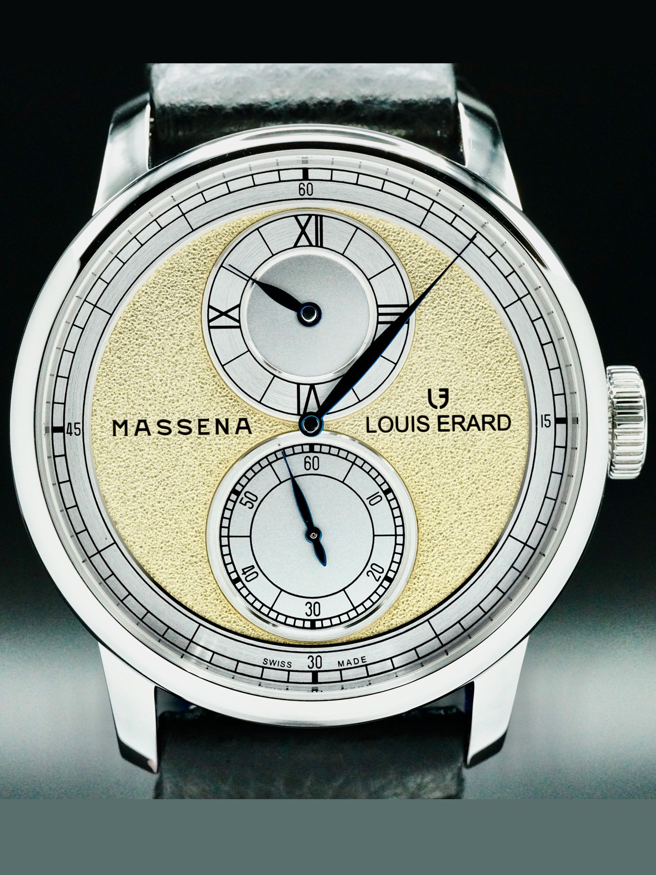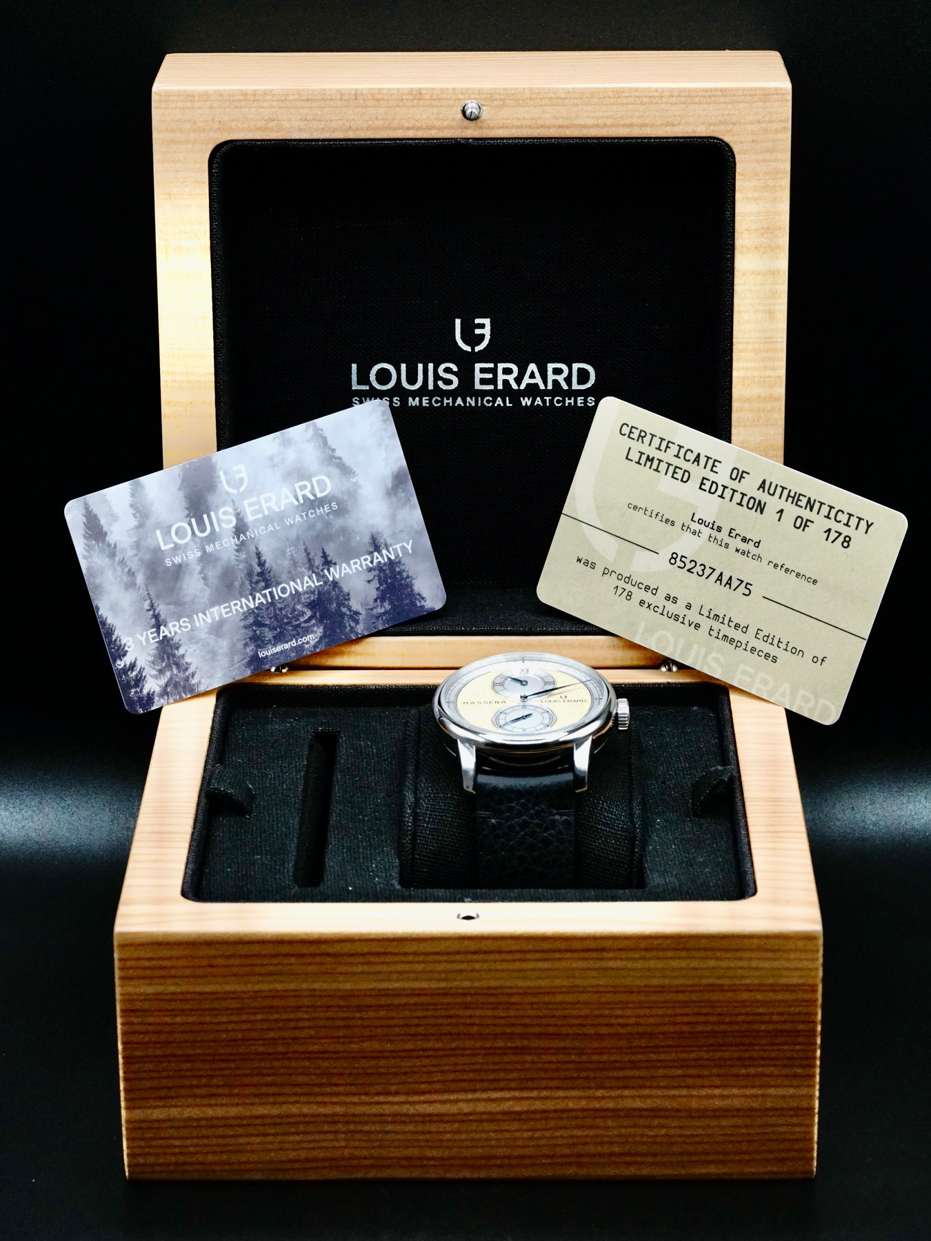 This Louis Erard x Massena Lab Le Régulateur 85237AA75.BVA103 is in EXCELLENT condition. This watch includes its original box, certificate of authenticity, and warranty card not dated. This watch has been fully authenticated and certified by Exquisite Timepieces. Limited Edition of 178 pieces.