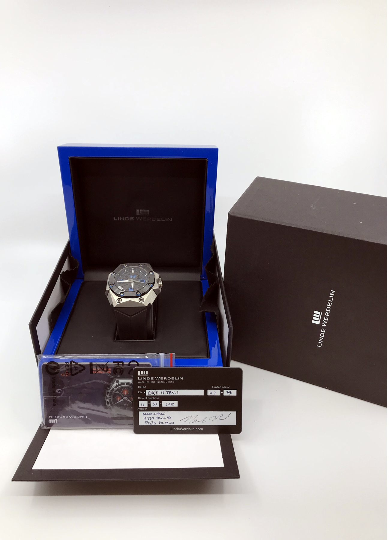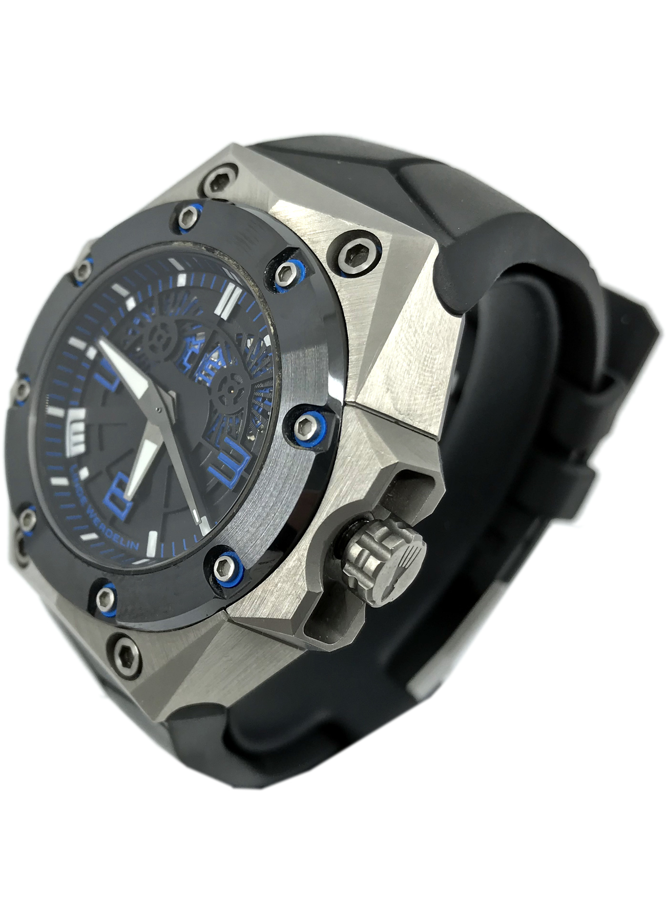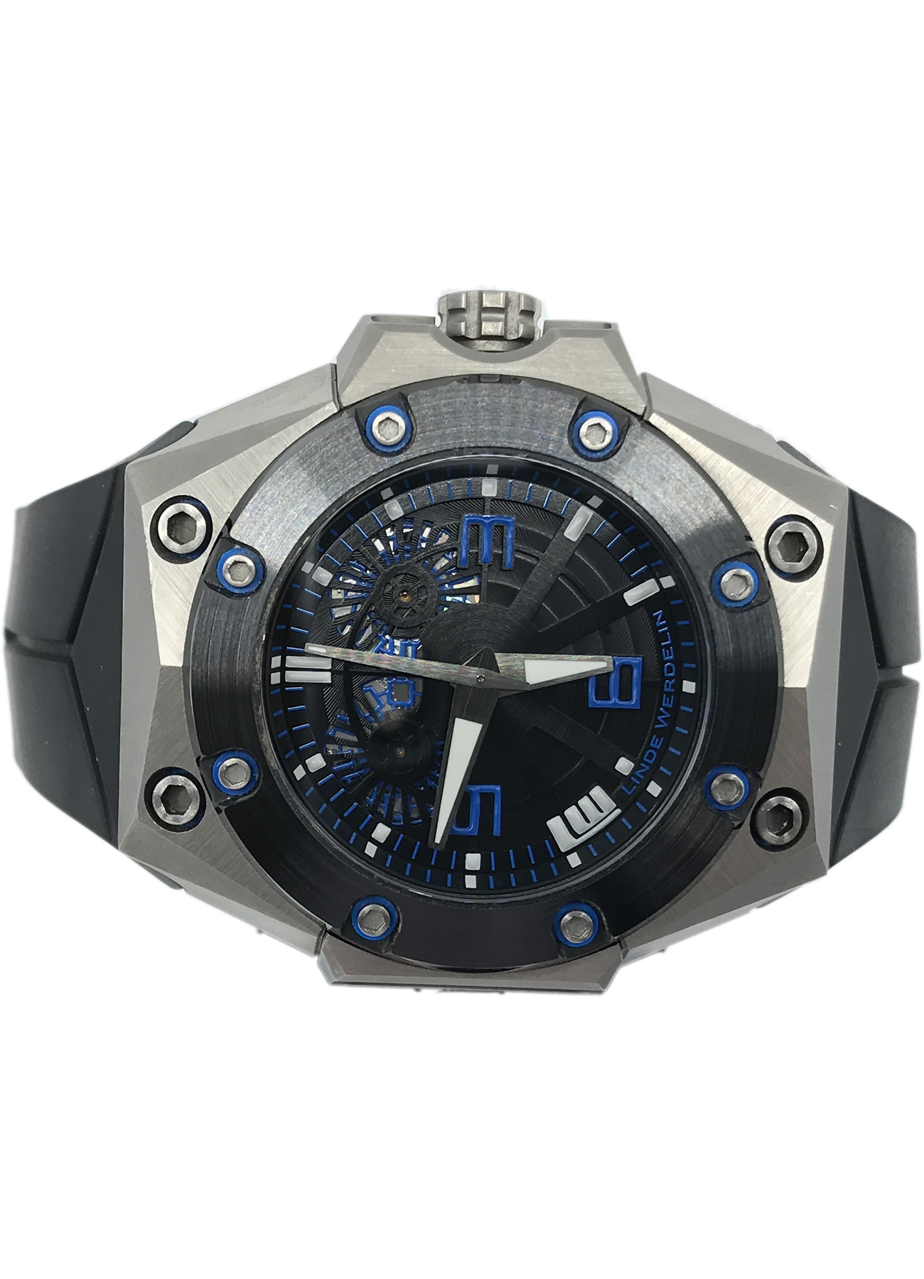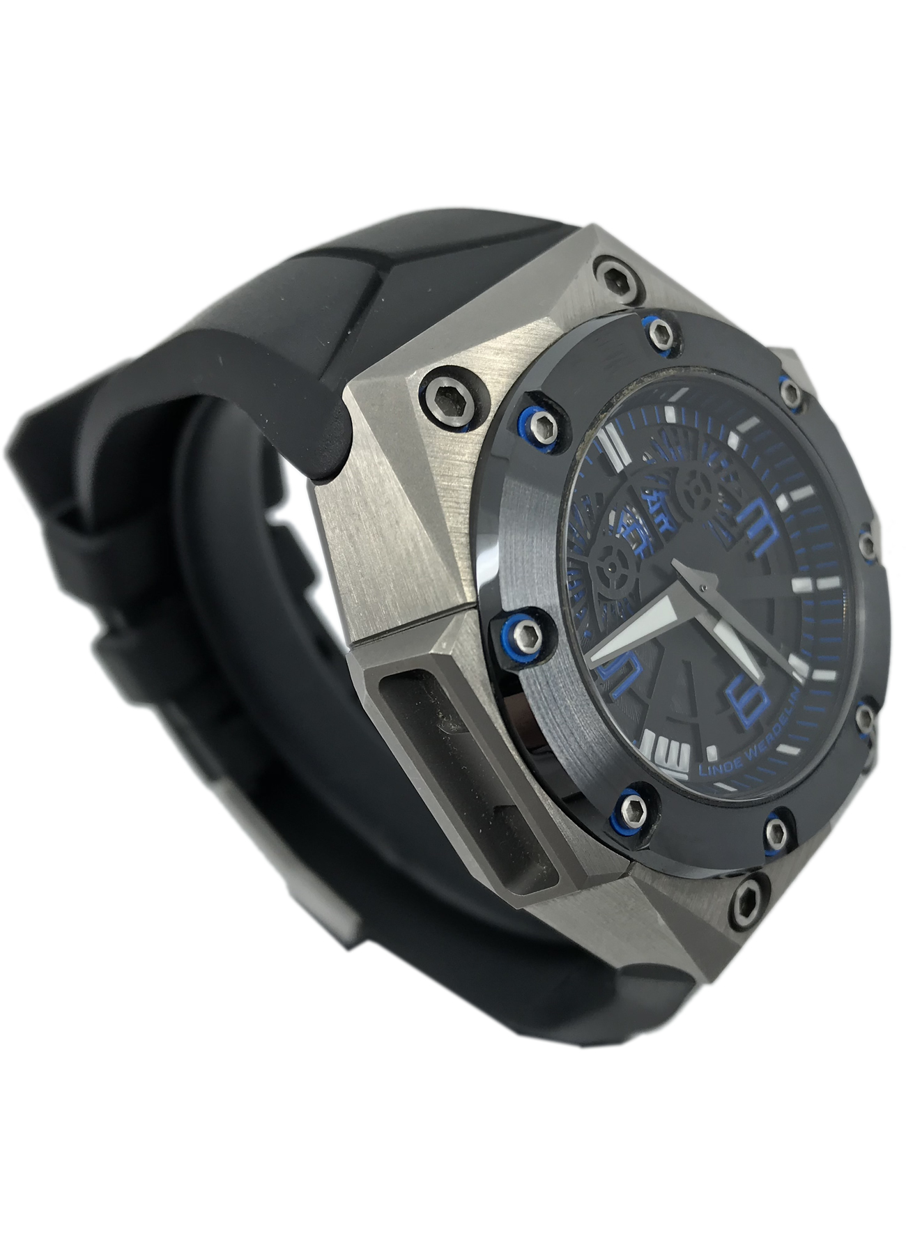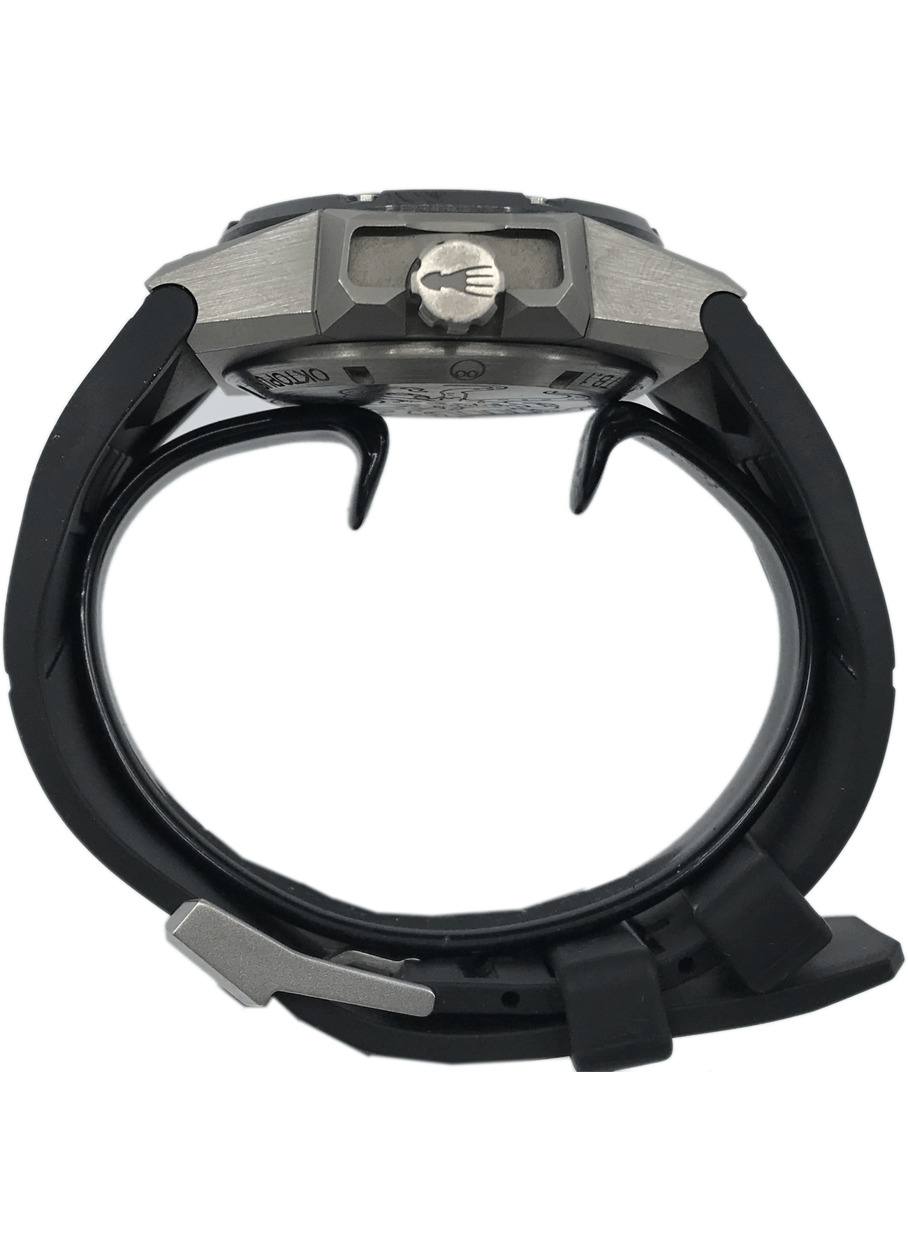 - This timepiece features a 46mm titanium case paired with a high quality rubber strap. It showcases a distinctive black dial and is powered by a precise automatic winding movement. The watch is designed with a water resistance of up to 300m.