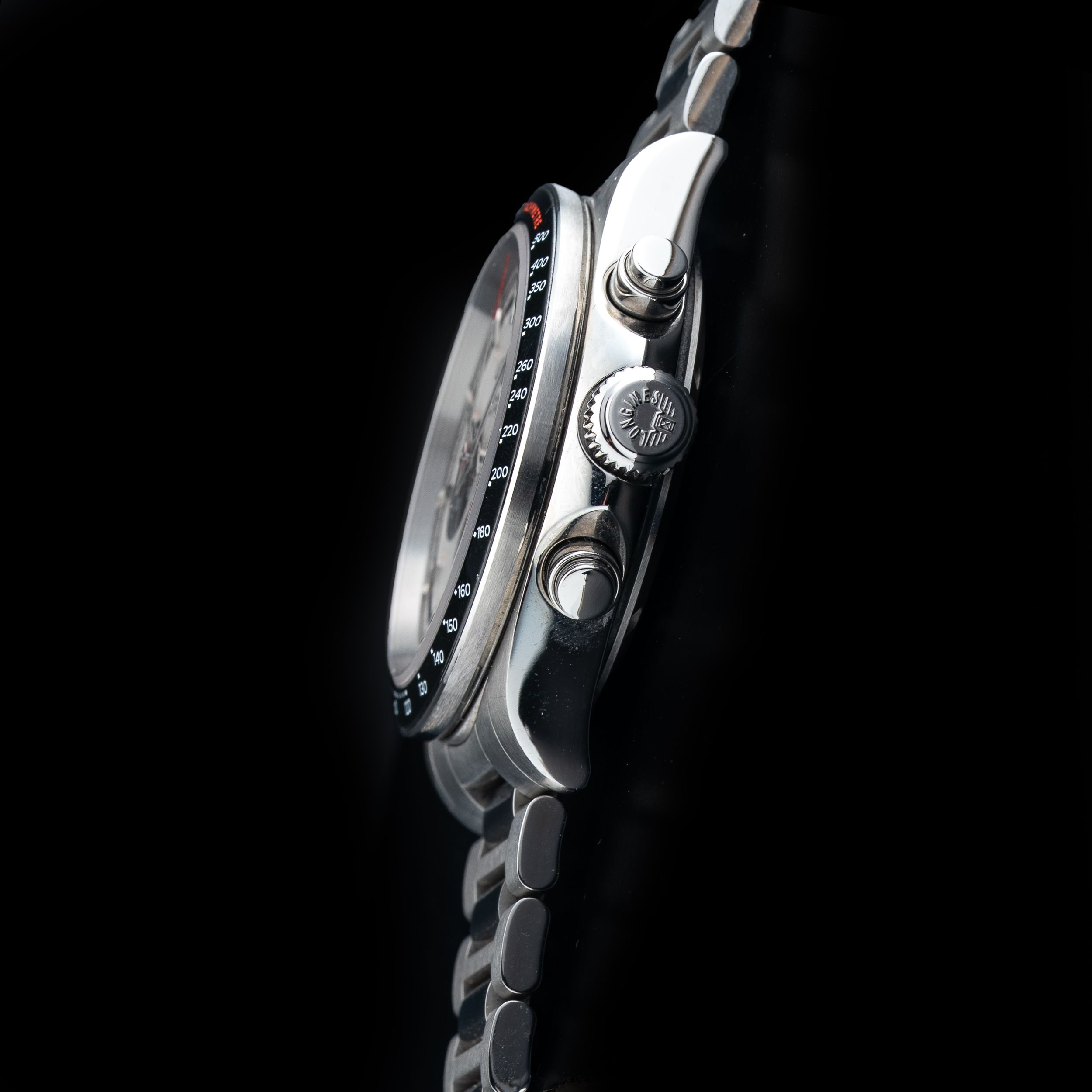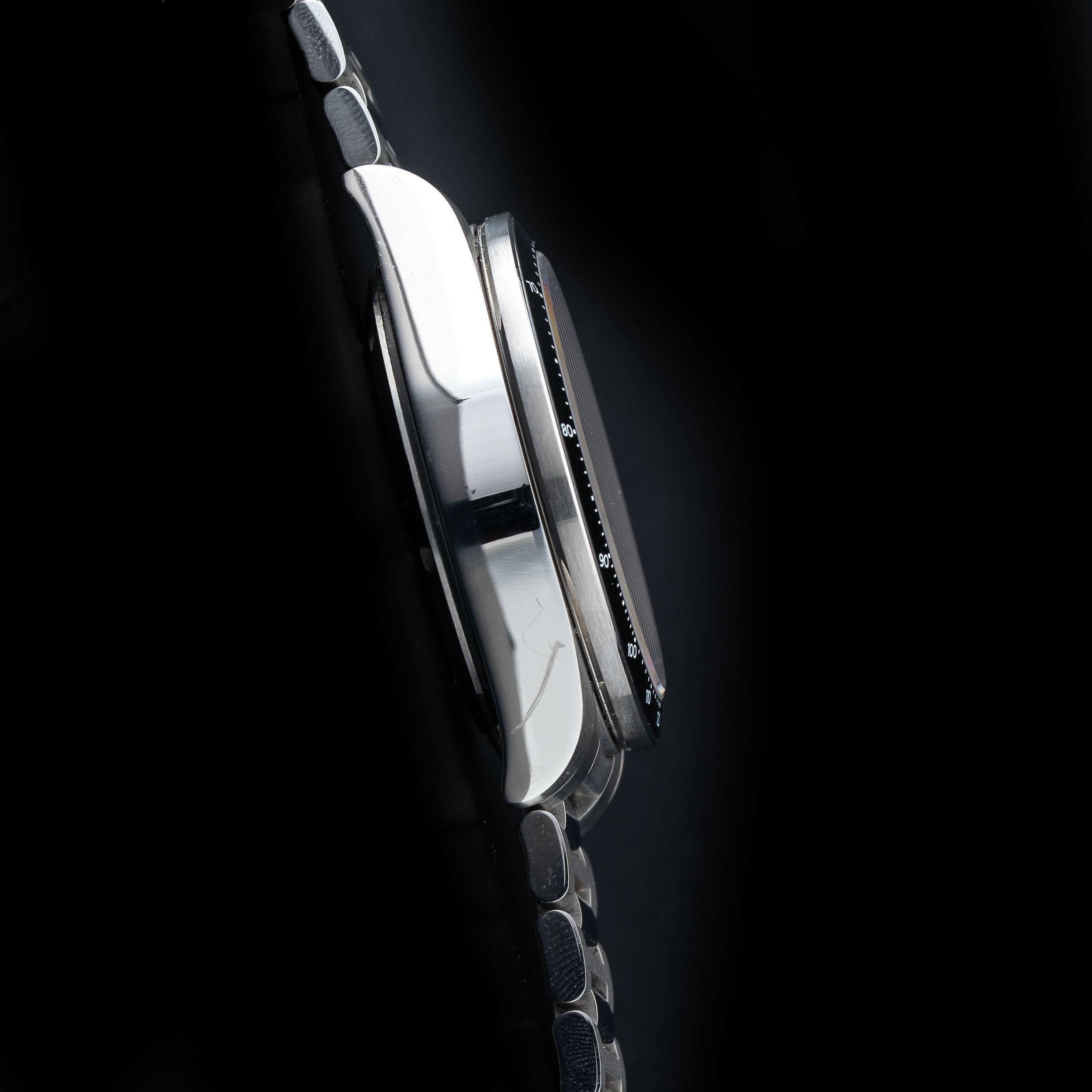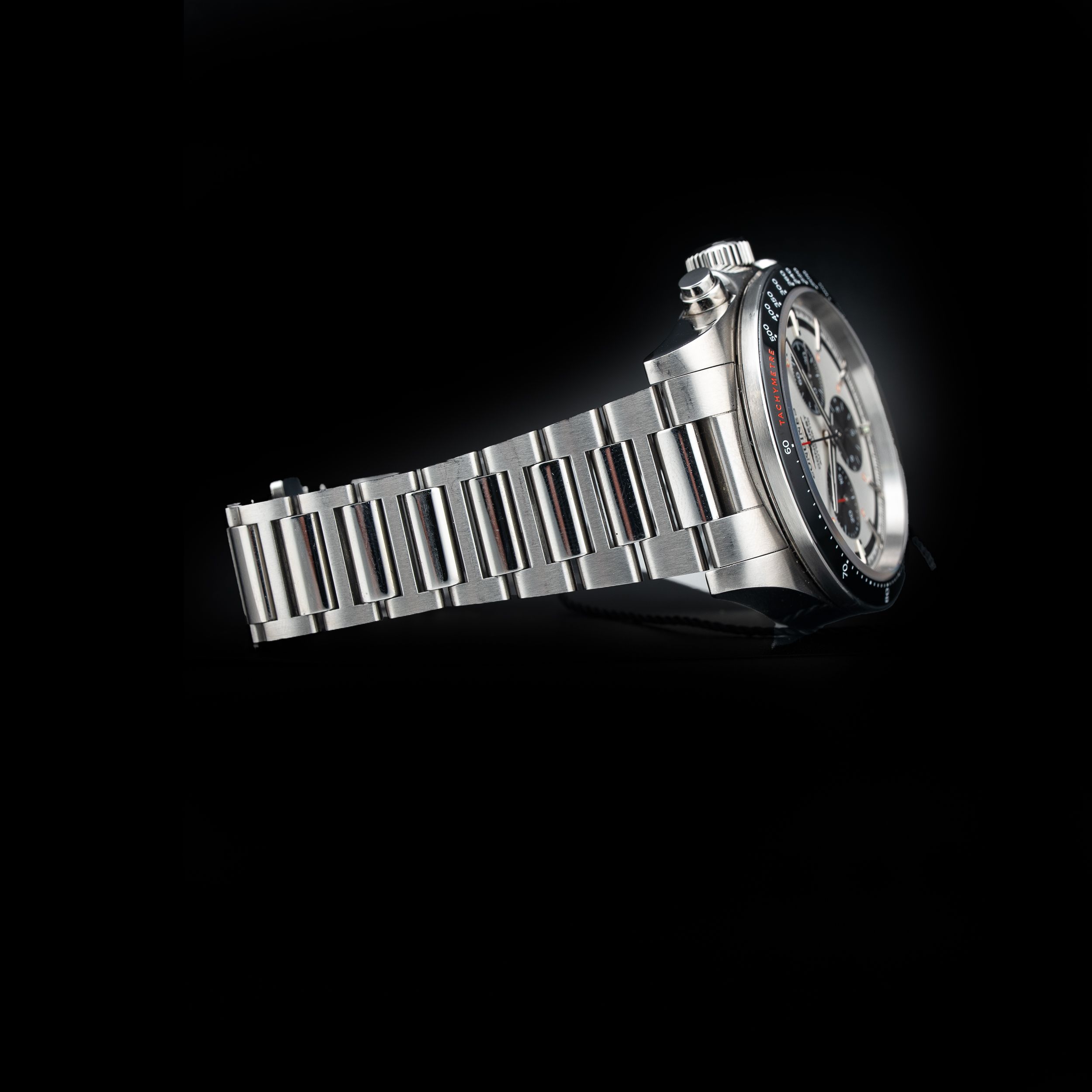 This watch features a 42mm stainless steel case on stainless steel bracelet. This watch also sports a silver dial. Powered by a self-winding mechanical movement. Water resistance up to 100 meters.