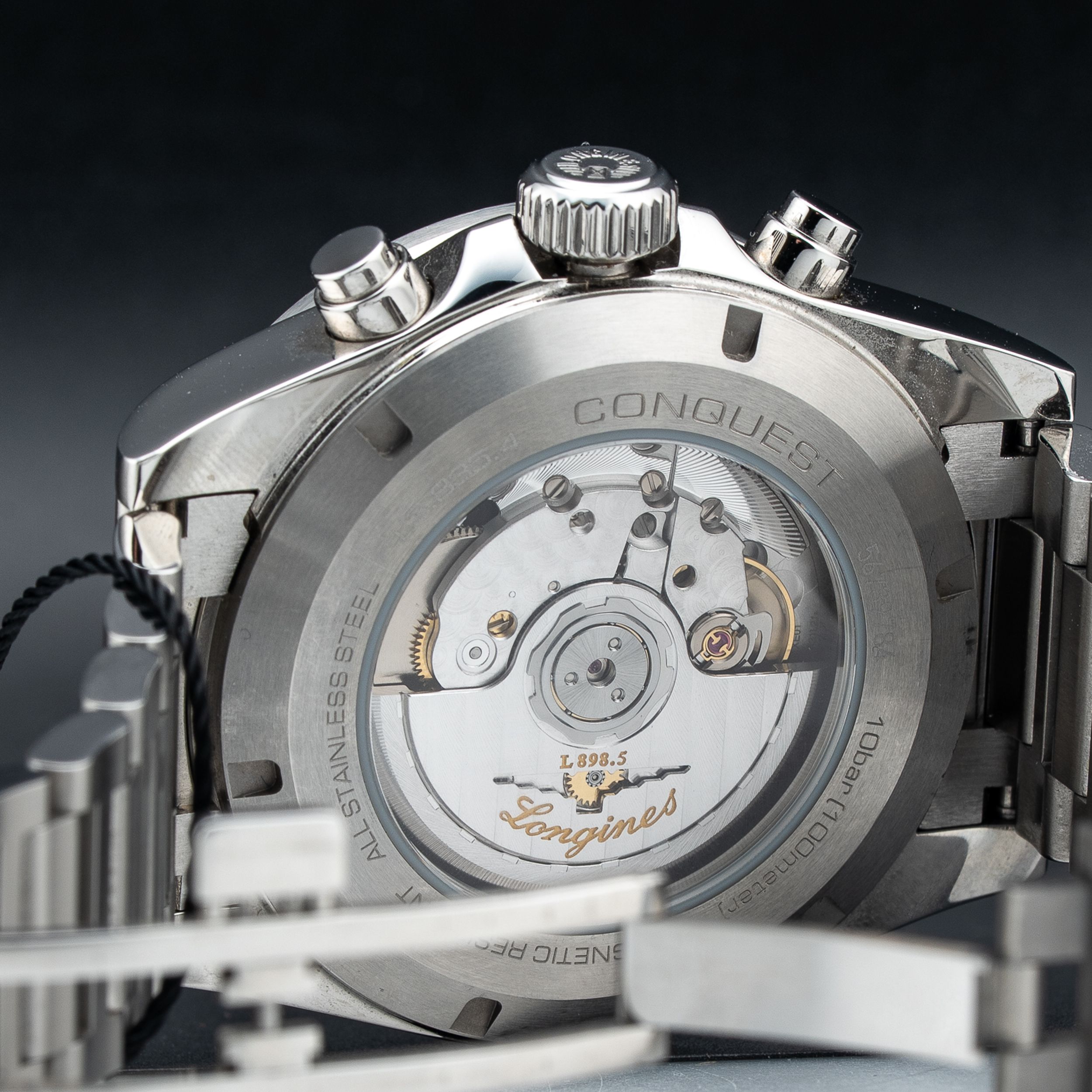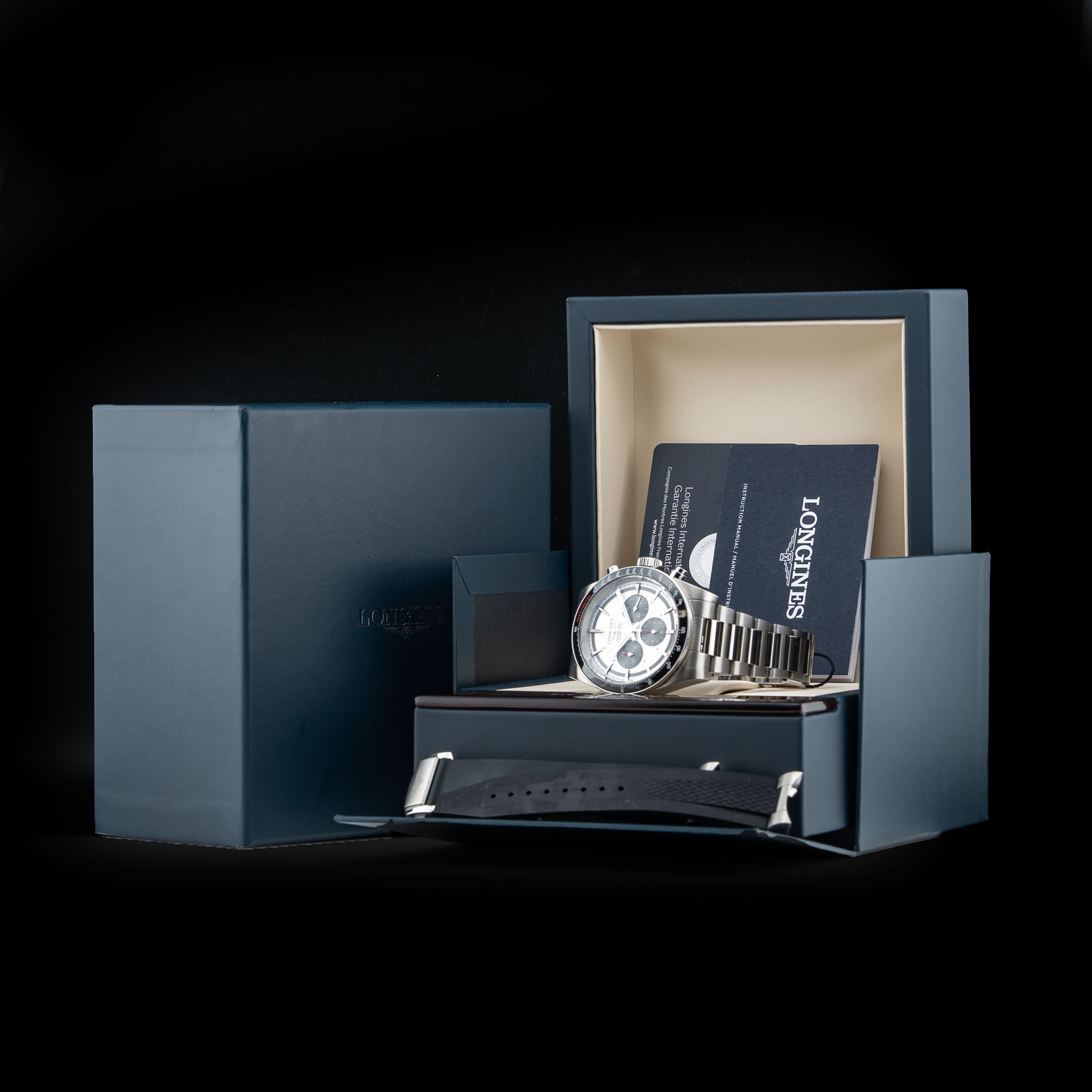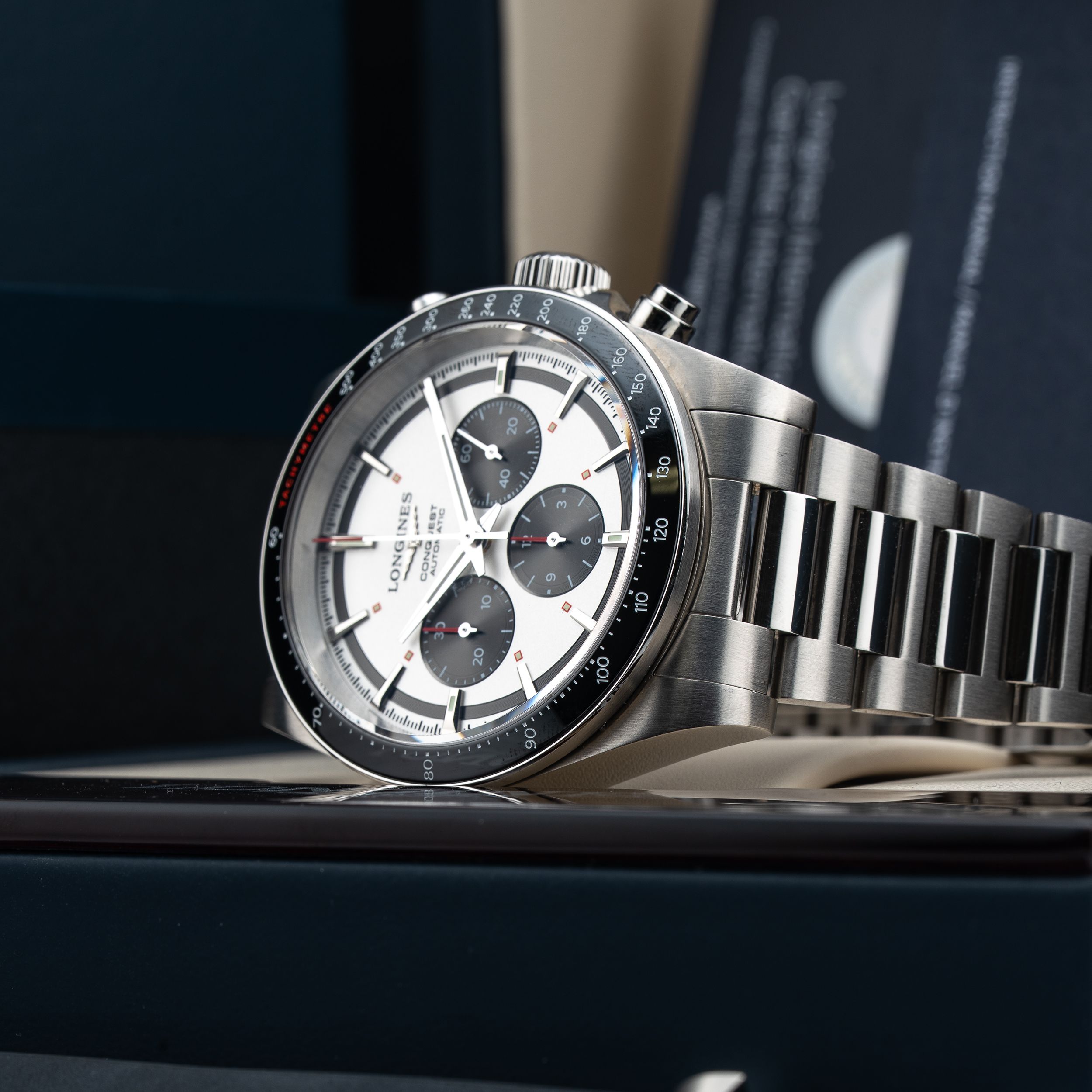 This Longines Conquest Chronograph Silver Dial L3.835.4.72.6 is in GREAT condition. This watch includes its Original Box, Original Papers and Warranty Card Dated 02/22/2025. This watch has been fully authenticated and certified by Exquisite Timepieces. Please note, the photos shown are of the actual watch you will receive.