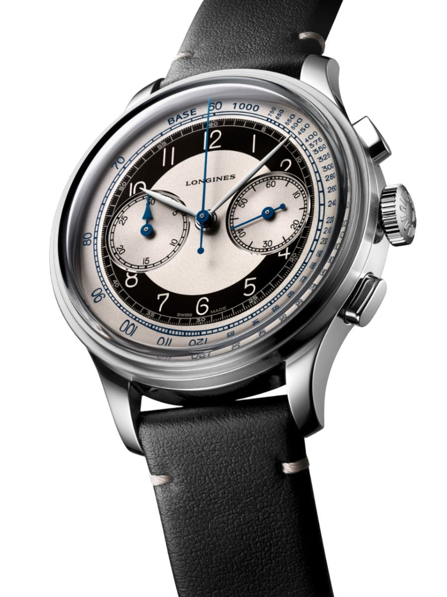 The chronograph version displays matt black, opaline and midnight blue, colours as elegant as they are refined. Several zones feature on its dial, and a tachymetric scale - quite rare for a Longines watch - also enriches its circumference, just like on the original model. The Longines Heritage Classic Chronograph - Tuxedo houses in its 40.00 mm-diameter case a movement (calibre L895.5) developed exclusively for Longines Heritage timepieces. It is also equipped with a silicon balance spring.