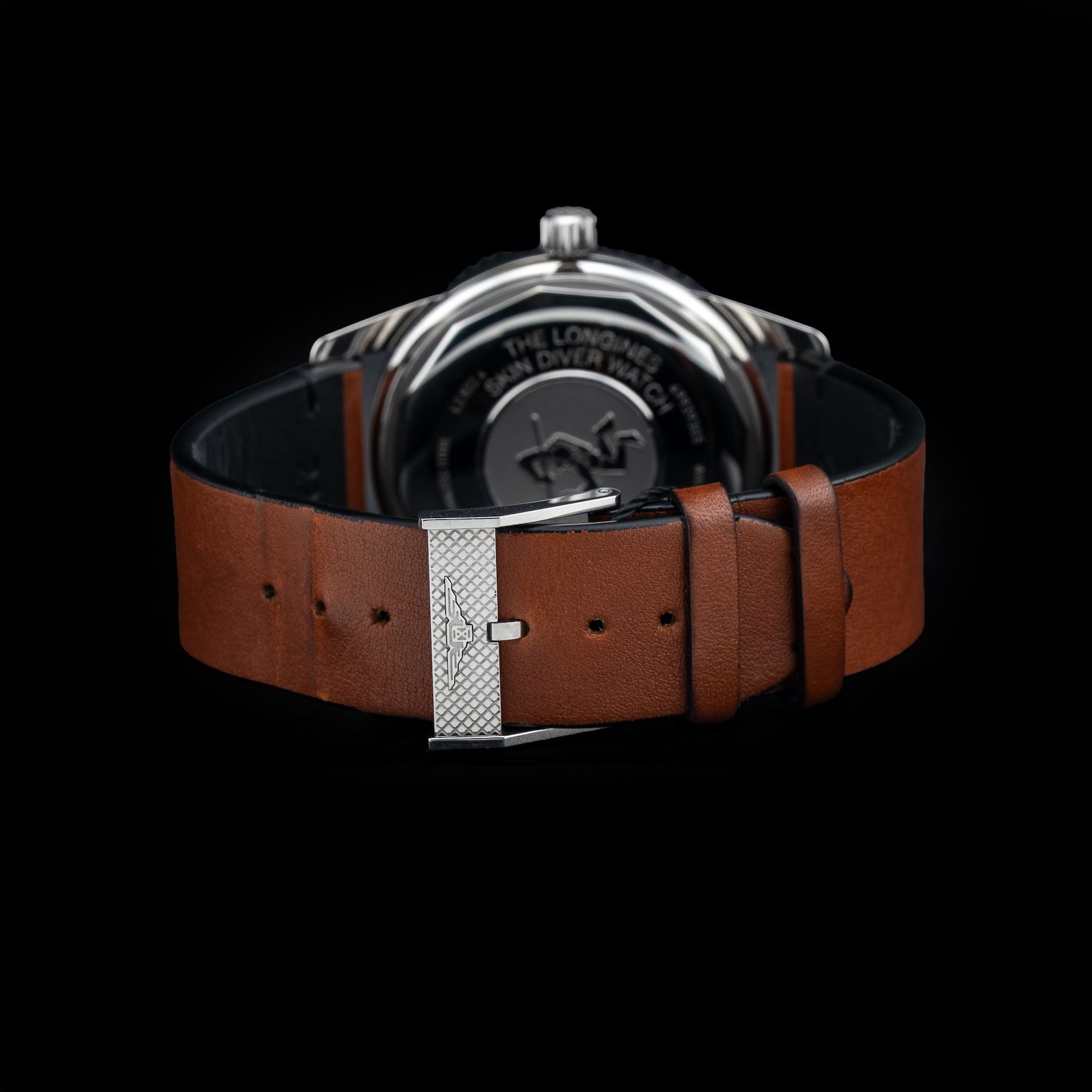 This watch features a 42mm stainless steel case on leather strap. This watch also sports a black dial. Powered by a mechanical automatic movement. Water resistance up to 300 meters.