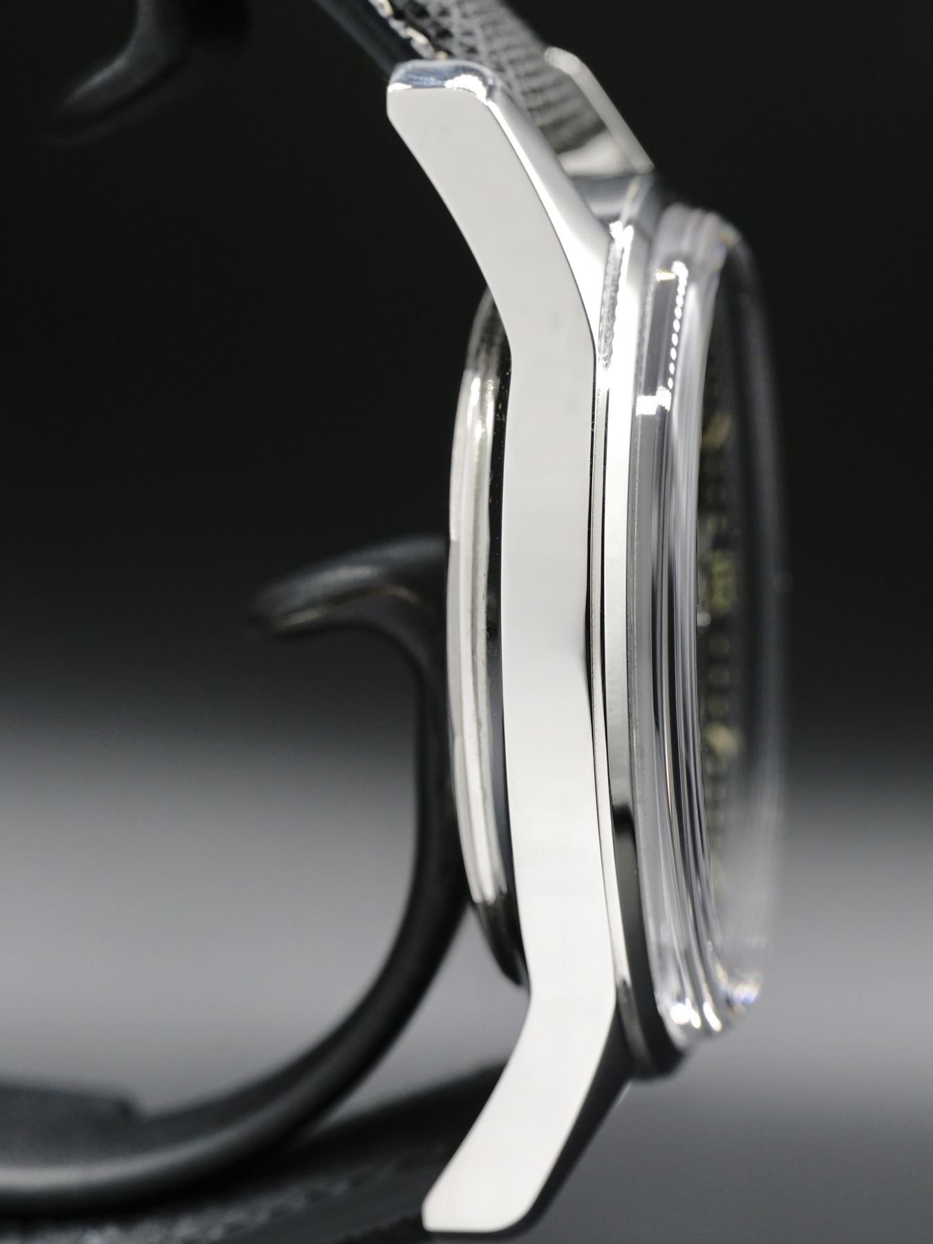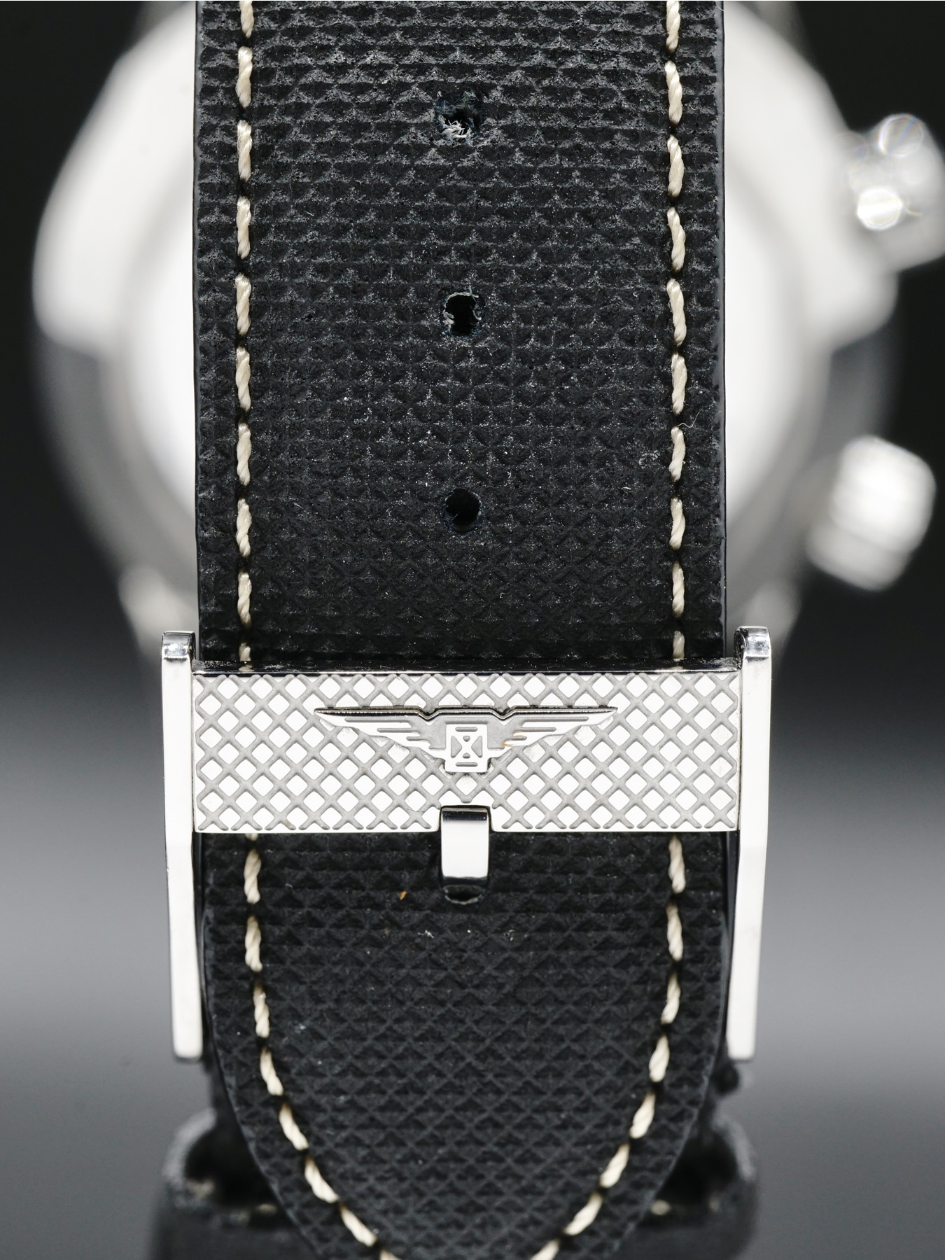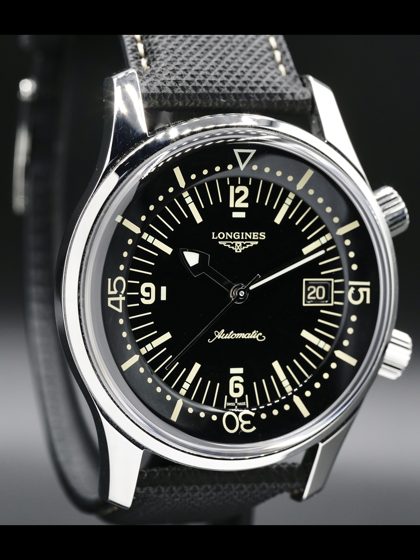 This Longines Legend Diver features a 42mm stainless steel case with a solid case back on a black leather & fabric strap. This watch also showcases a black lacquered and polished dial with luminous, silver polished hands covered by scratch-resistant sapphire crystal with several layers of anti-reflective coating on the underside.