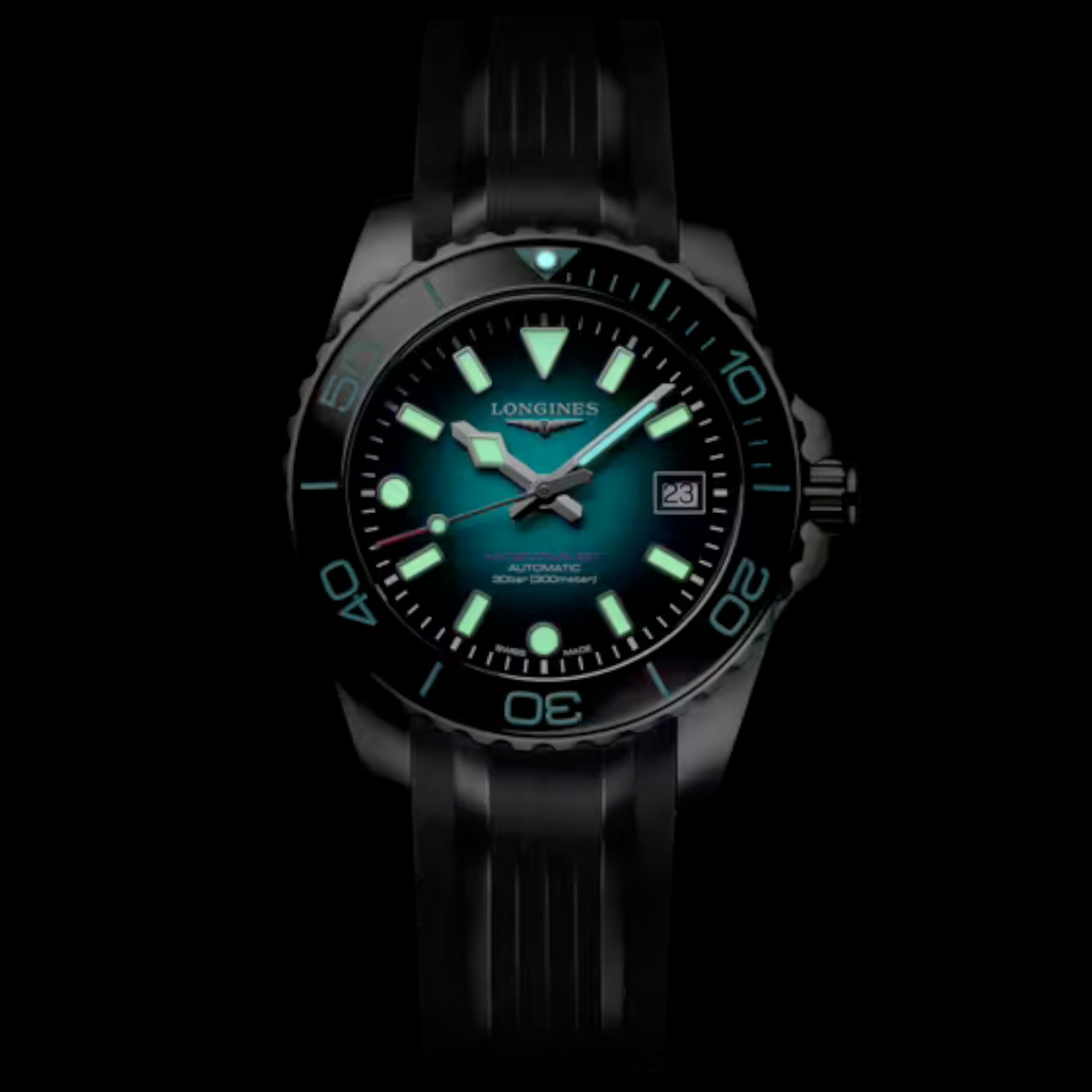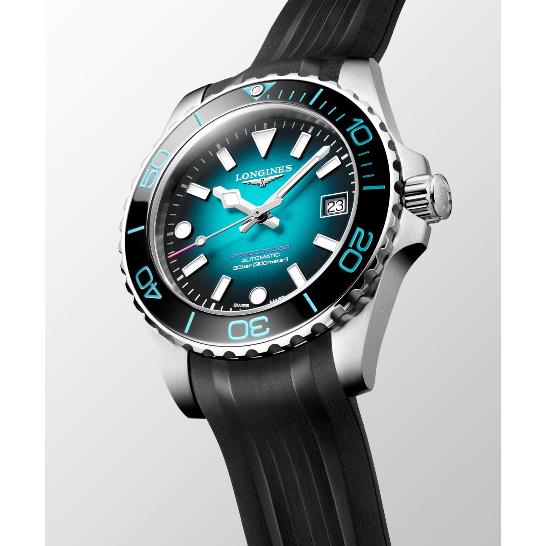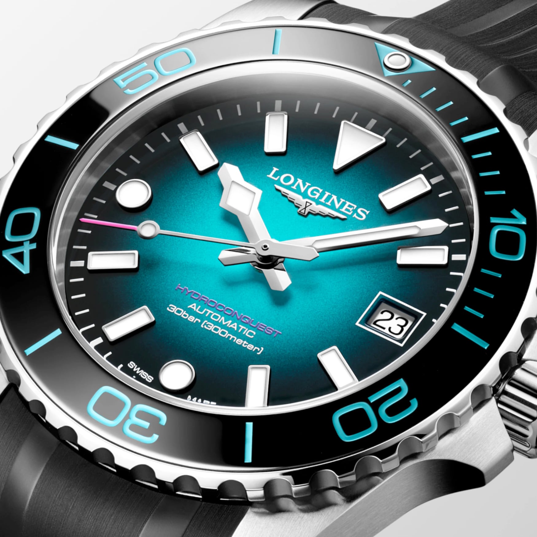The HYDROCONQUEST collection blends modern aesthetics with proven performance. Powered by an exclusive LONGINES automatic calibre, water-resistant up to 30 bar (300 m), with unidirectional bezel, screw-in crown and screw-down case back.