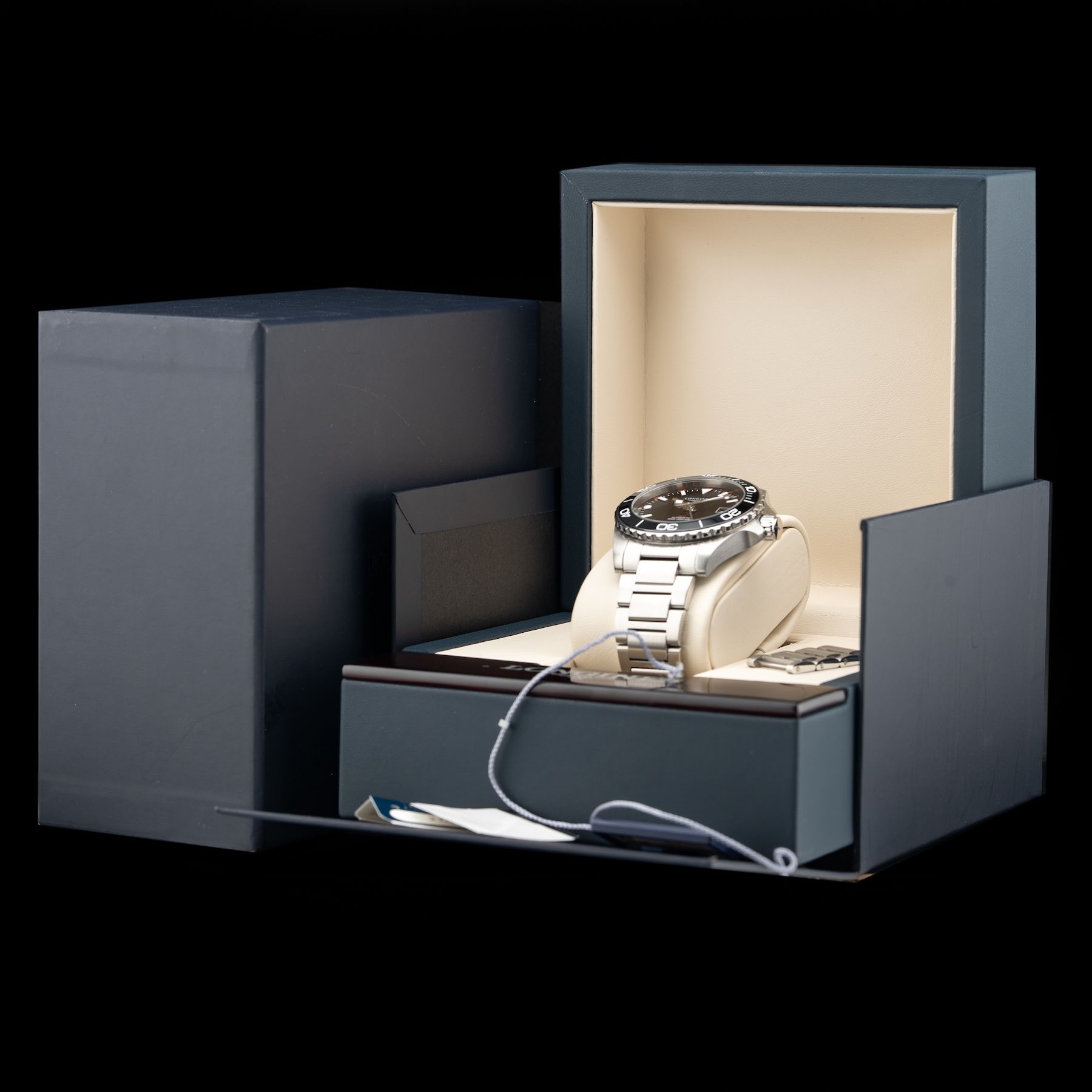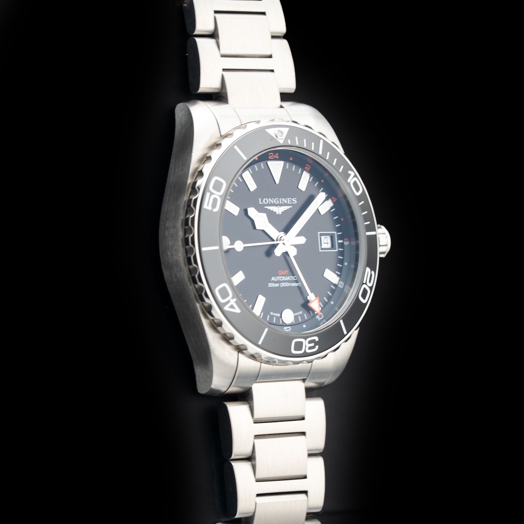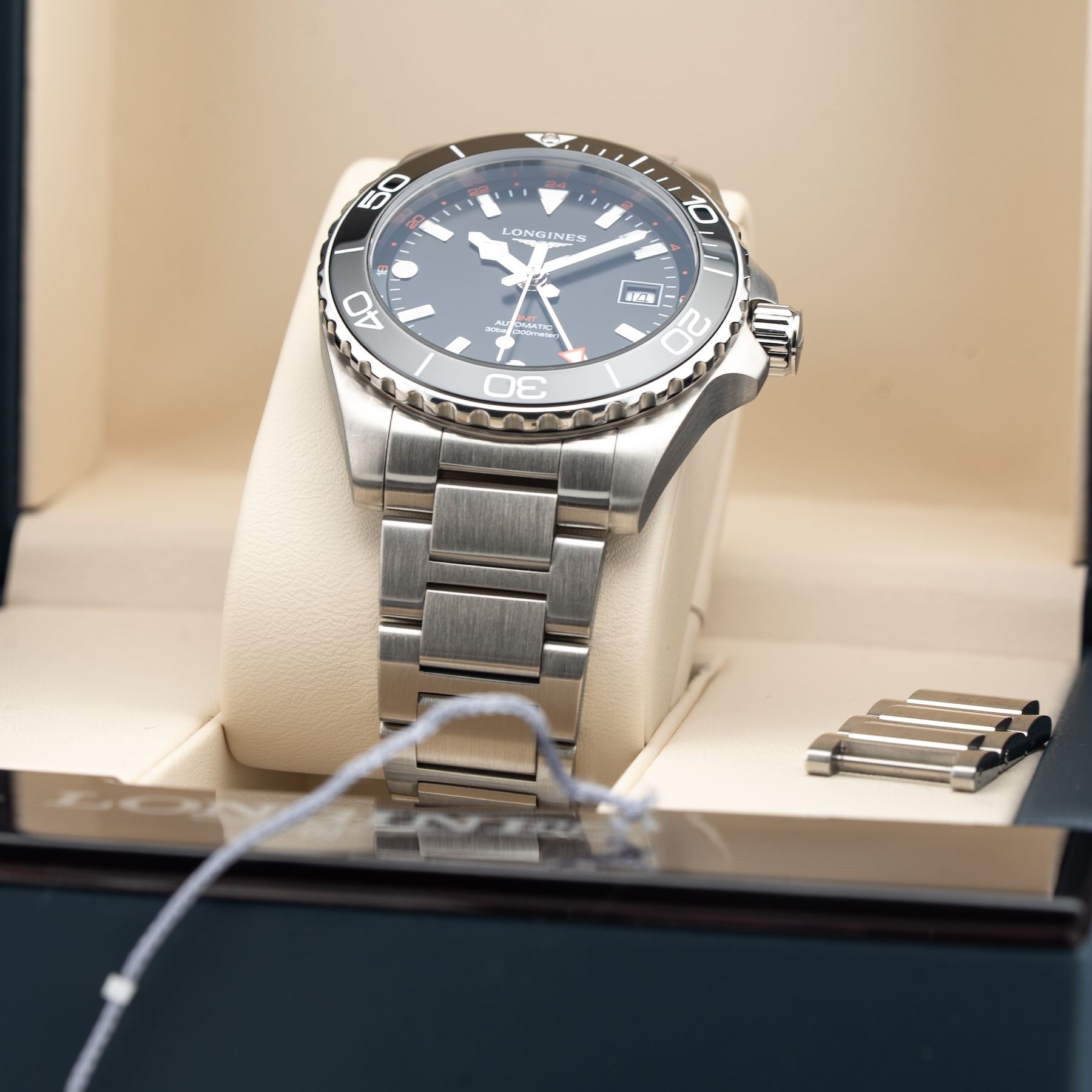 This Longines Hydroconquest L3.790.4.56.6 GMT Black Dial 41 is in GREAT condition. This watch includes its Original Box, Original Papers. This watch has been fully authenticated and certified by Exquisite Timepieces.