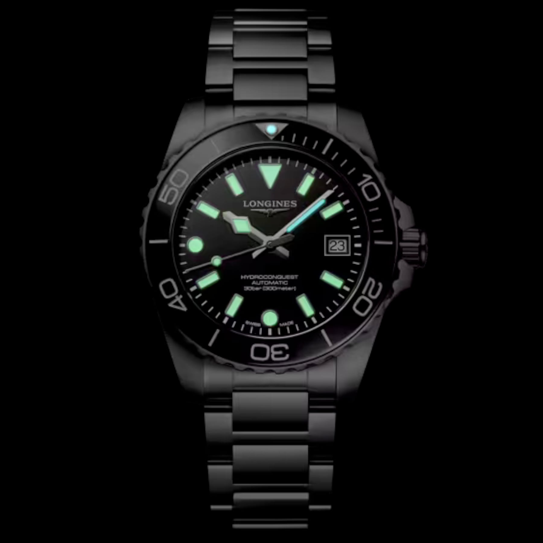 The HYDROCONQUEST collection blends modern aesthetics with proven performance. Powered by an exclusive LONGINES automatic calibre, water-resistant up to 30 bar (300 m), with unidirectional bezel, screw-in crown and screw-down case back.