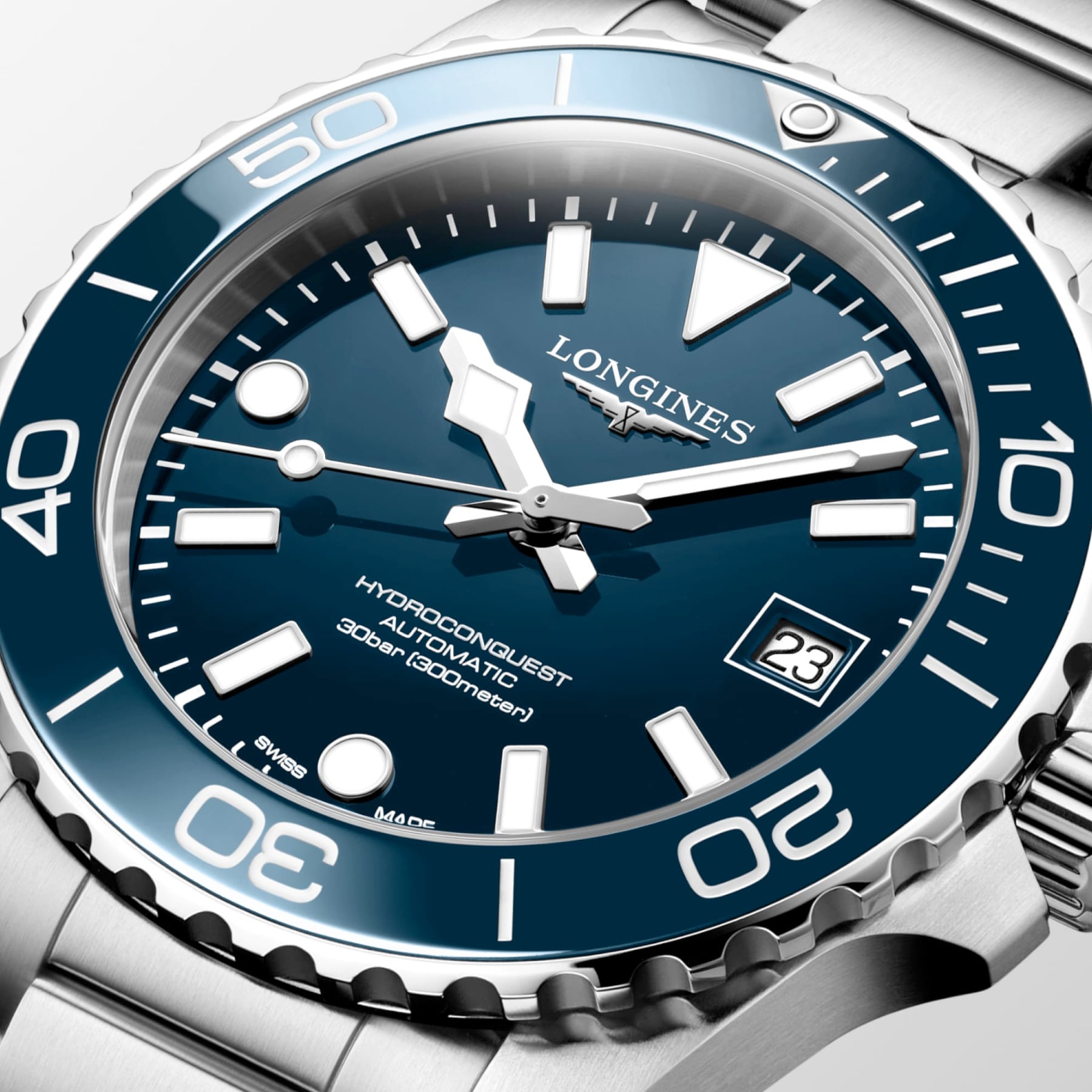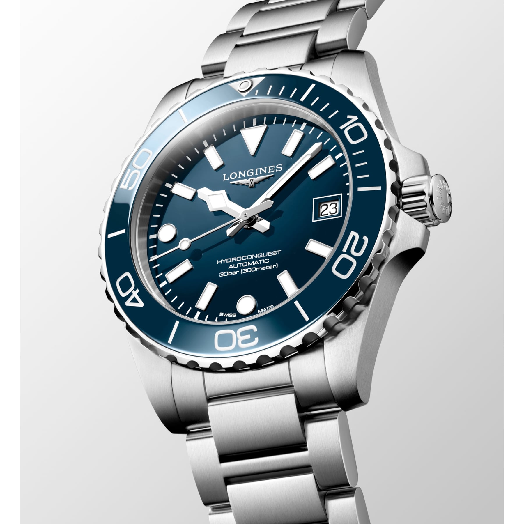 The HYDROCONQUEST collection blends modern aesthetics with proven performance. Powered by an exclusive LONGINES automatic calibre, water-resistant up to 30 bar (300 m), with unidirectional bezel, screw-in crown and screw-down case back.