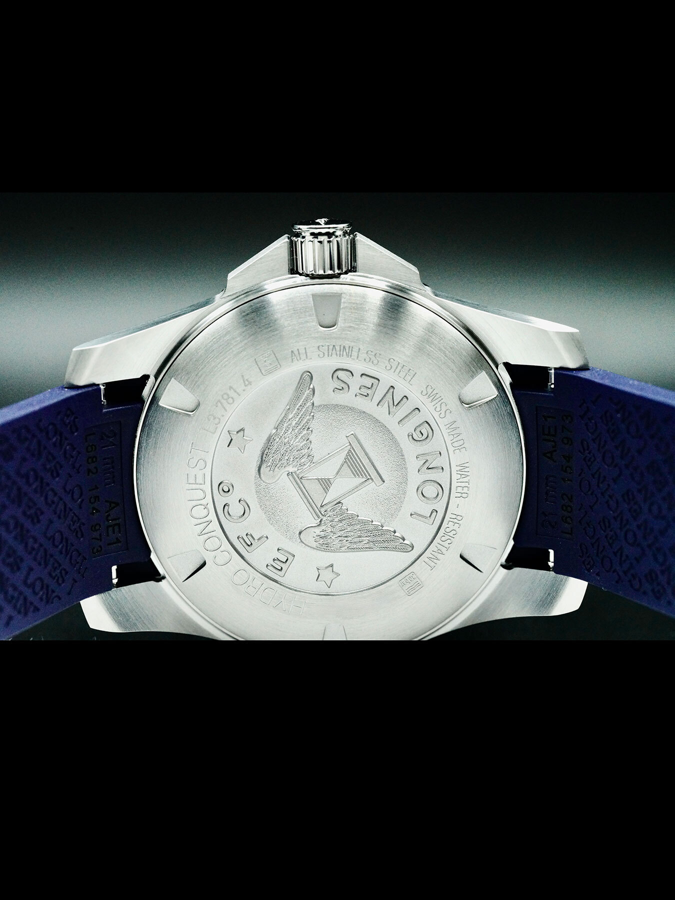 This Longines Hydroconquest features a 41mm stainless steel case with a solid case back on a blue rubber strap. This watch also sports a blue dial with luminous hands and index dial markers covered by scratch resistant sapphire crystal.